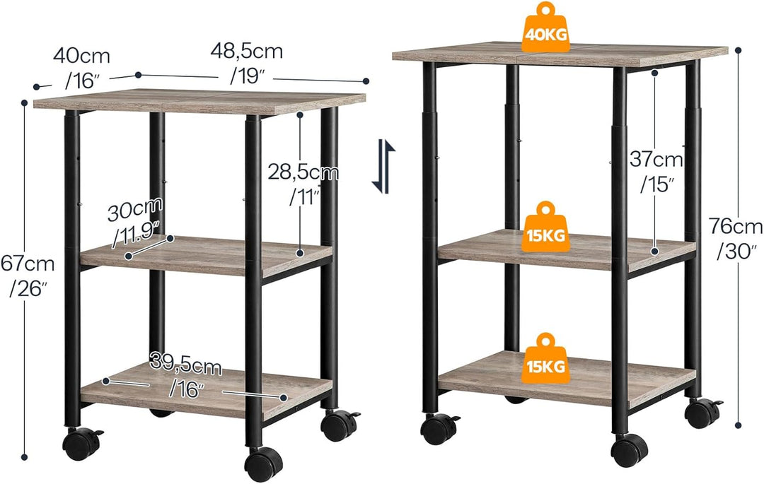 - Dreistöckiges Design: Grösse des druckertisch rollbar: 48.5 x 40 x 67 cm, höhenverstellbar, obere platte kann problemlos bis zu 40 kg tragen. sie können den drucker auf die platte stellen, die unteren beiden platten können 15 kg tragenn