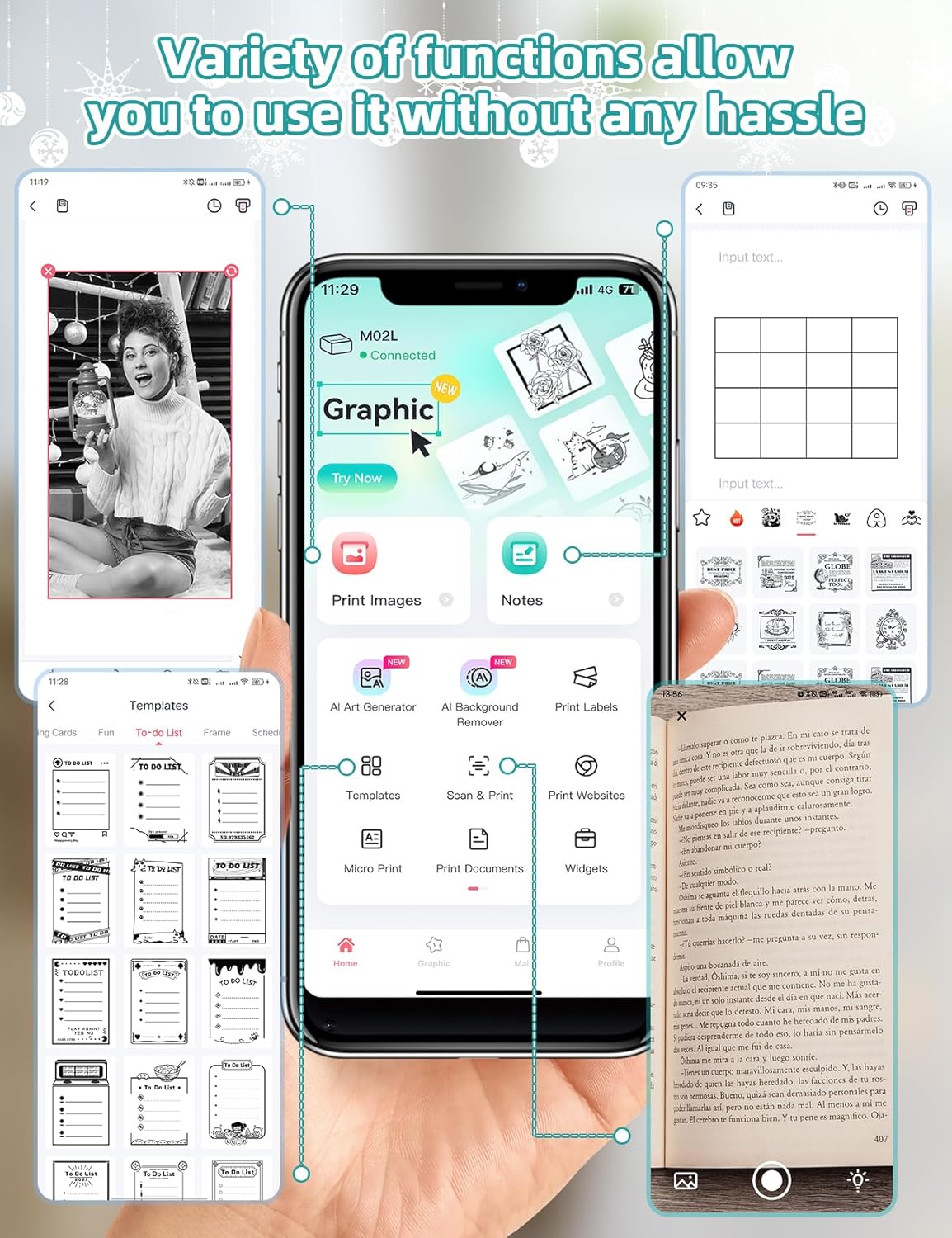 - Kreatives Heimwerken: Der mini drucker für smartphone ist zum Lernen und für den Spass gedacht! Mit mehr als 1000+Vorlagen, 600+Schriftarten, 5000+ Grafiken, Druckbildern, DIY-Notizen und einstellbaren Schriftarten, AI Art Generator und AI Background