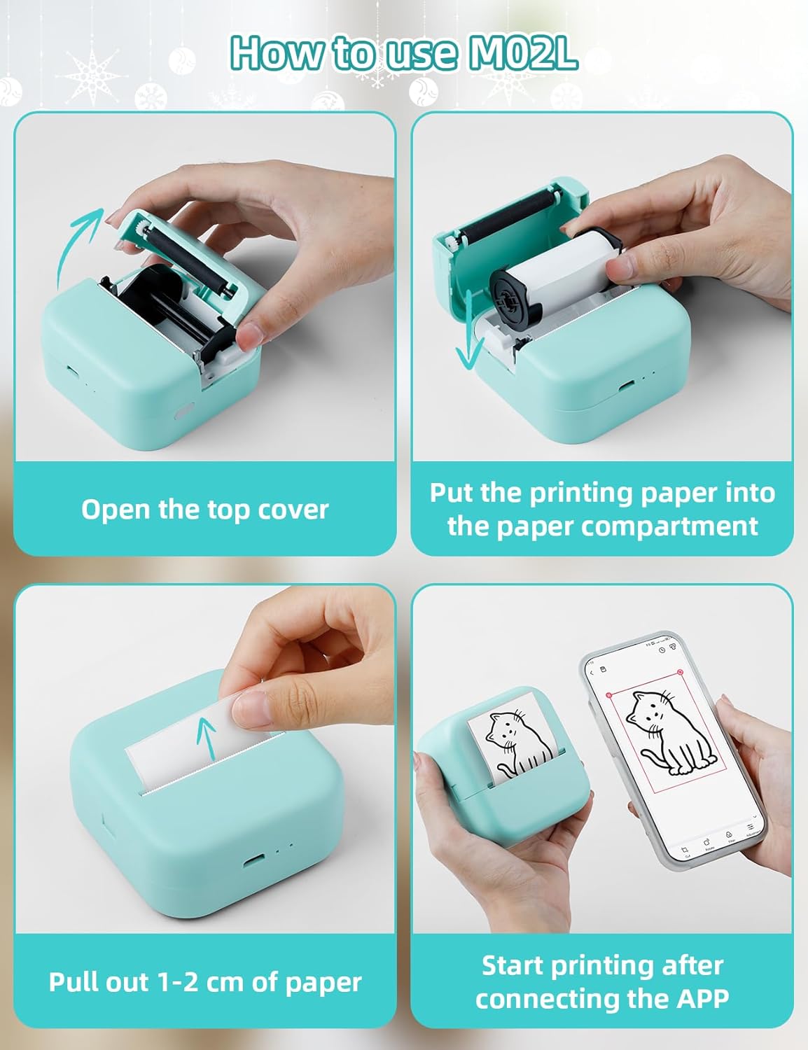 - Multifunktions thermodrucker mini: Der mini thermodrucker M02L ist ideal für alle Altersgruppen. Er ermöglicht das Drucken von Fotos, Studiennotizen, Journalen, falschen Fragen, Memos, Einkaufslisten, Lesezeichen, Grusskarten sowie Persönliche und