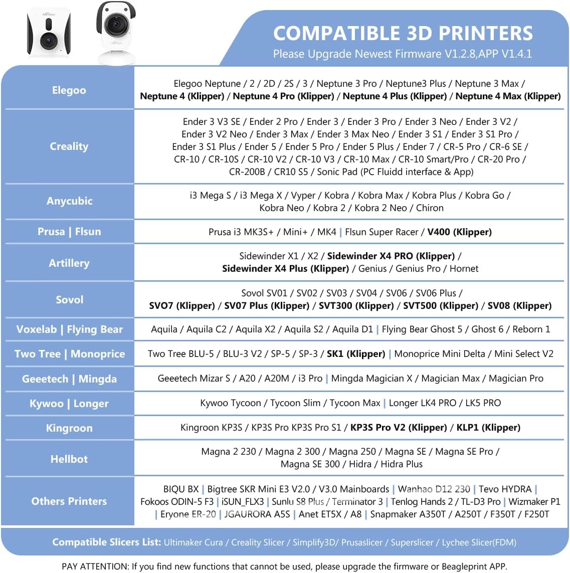 - ✨【BREITE KOMPATIBILITÄT】Diese WLAN-Fernbedienungskamera ist so konzipiert, dass sie mit über 100 FDM-3D-Druckermodellen kompatibel ist, wie z. B. Creality Ender 3/Pro/V2/max/S1/S1 Pro, Anycubic Kobra Vyper/Max/Plus, Voxelab/ Elegoo/Prusa usw.