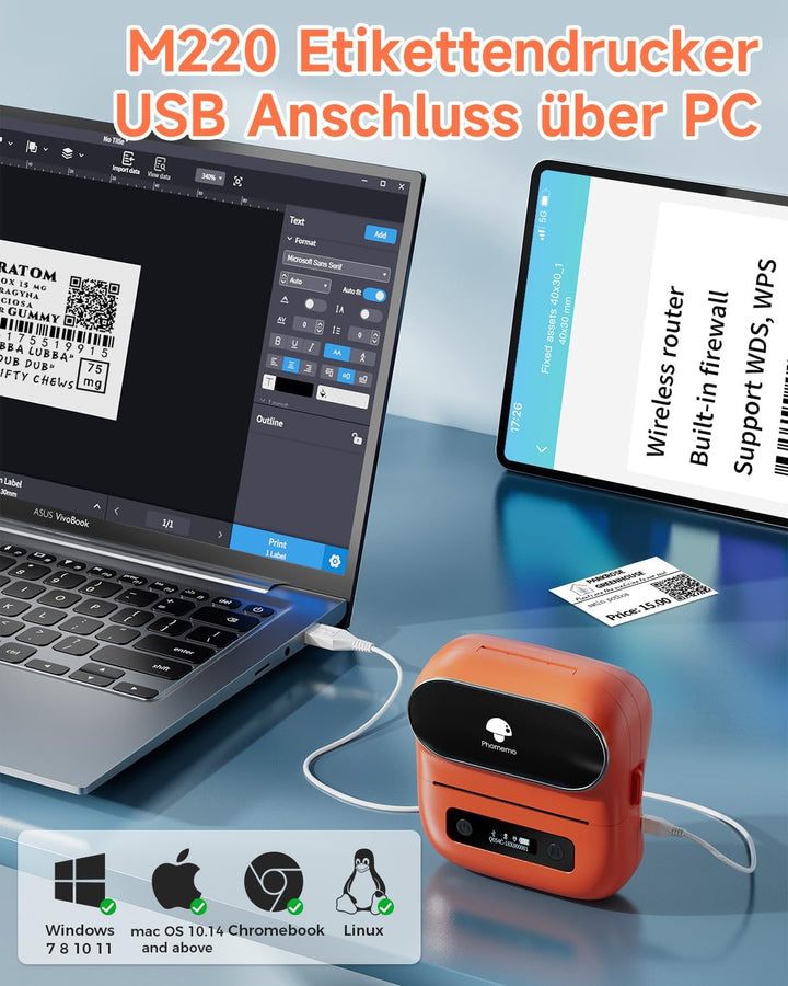 - Hohe Kompatibilität - Der Phomemo M220 Etikettendrucker unterstützt nicht nur iOS und Android-Mobiltelefone über eine Bluetooth-Verbindung, sondern unterstützt auch eine USB-Verbindung für MAC und Windows 7 10 11.