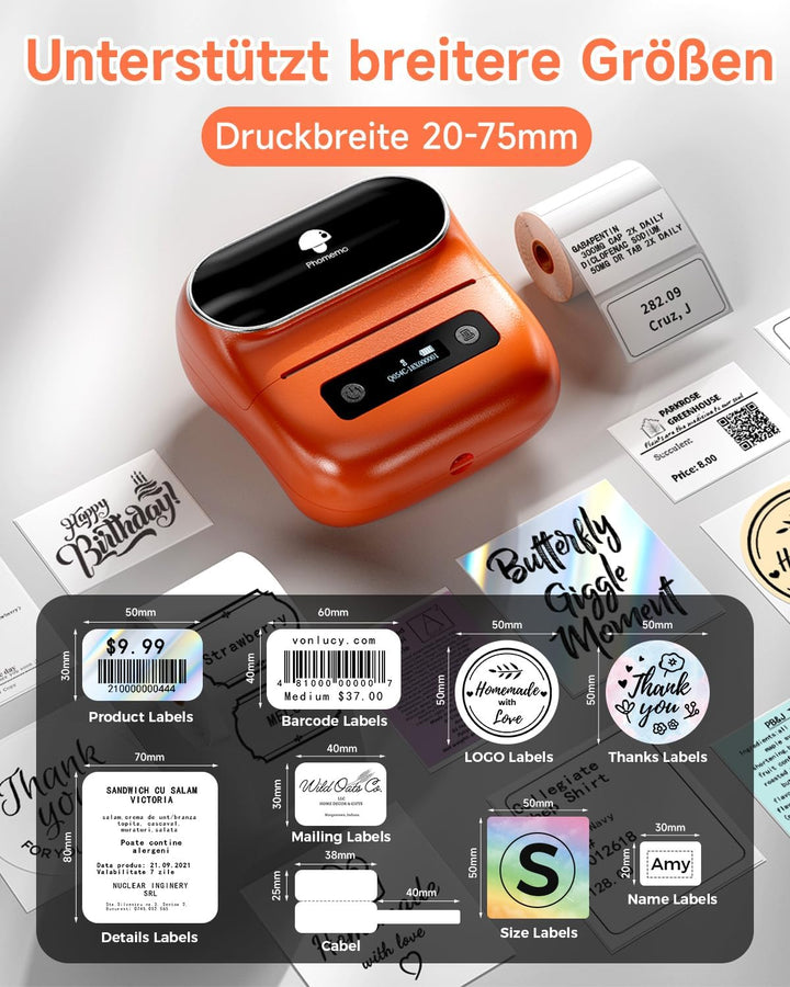 - Weit verbreitete Verwendung - Der M220 Bluetooth Etikettendrucker bietet eine Vielzahl von Verwendungsmöglichkeiten und kreativen Möglichkeiten. Geniessen Sie es, überall etwas zu etikettieren, wie kleine Unternehmen: Kleidung, Kunsthandwerk,