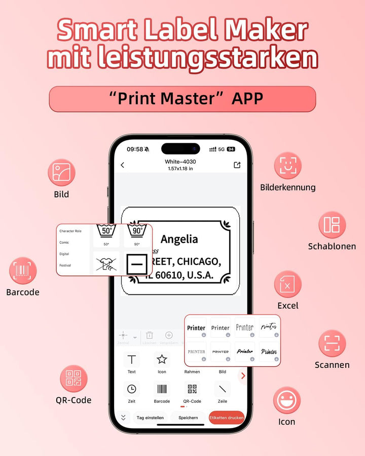 - Kostenlose und leistungsstarke App - Die von Phomemo selbst entwickelte kostenlose Bearbeitungs-App "Print Master" ist einfach zu bedienen. Unterstützung von Barcodes, QR-Codes, Bildern, intelligenter OCR, Spracherkennung, massiven lebendigen Symbolen,