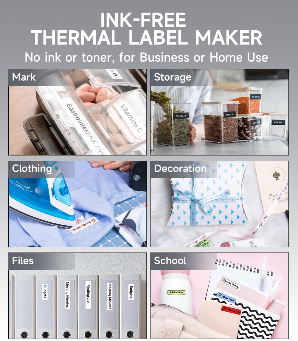 - 【Vielseitiger P12 Etikettendrucker】Der P12 Mini-Etikettendrucker hebt sich von anderen Etikettendruckern ab, da er sowohl Thermo- als auch Thermotransferetiketten unterstützt. Damit werden die Einschränkungen von Thermo-Etiketten überwunden, die