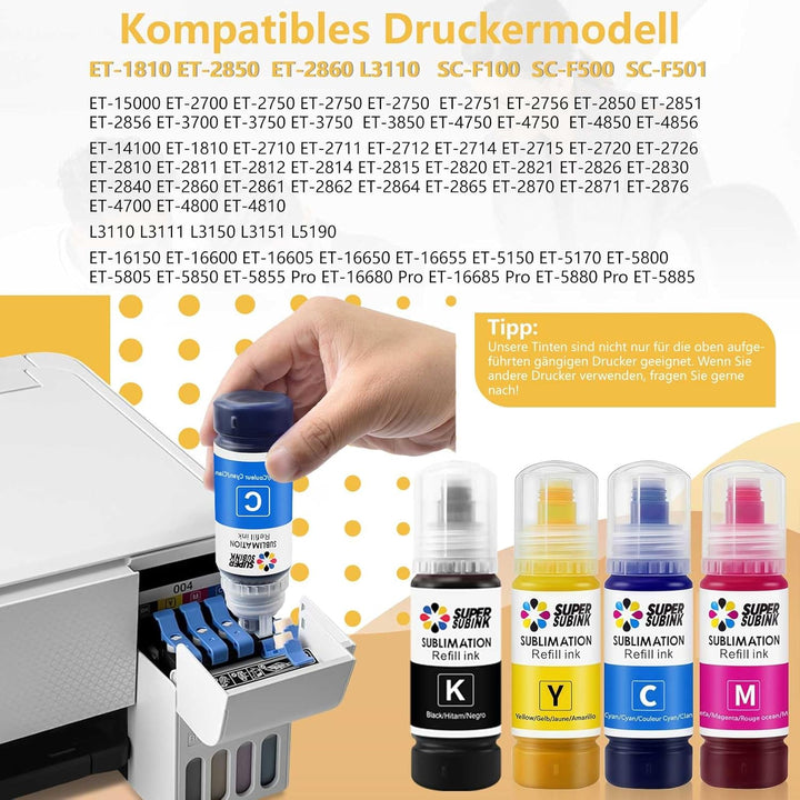 - Kompatibilität mit Epson EcoTank-Druckern: Sublimationstinten-Nachfüllflaschen kompatibel mit allen Epson ET-1810 ET-2810 ET-2811 ET-2812 ET-2814 ET-2815 ET-2820 ET-2821 ET-2826 ET-2830 ET-2840 ET-2850 ET-2851 ET-2856 ET-2860 ET-2861 ET-2862 ET-2864