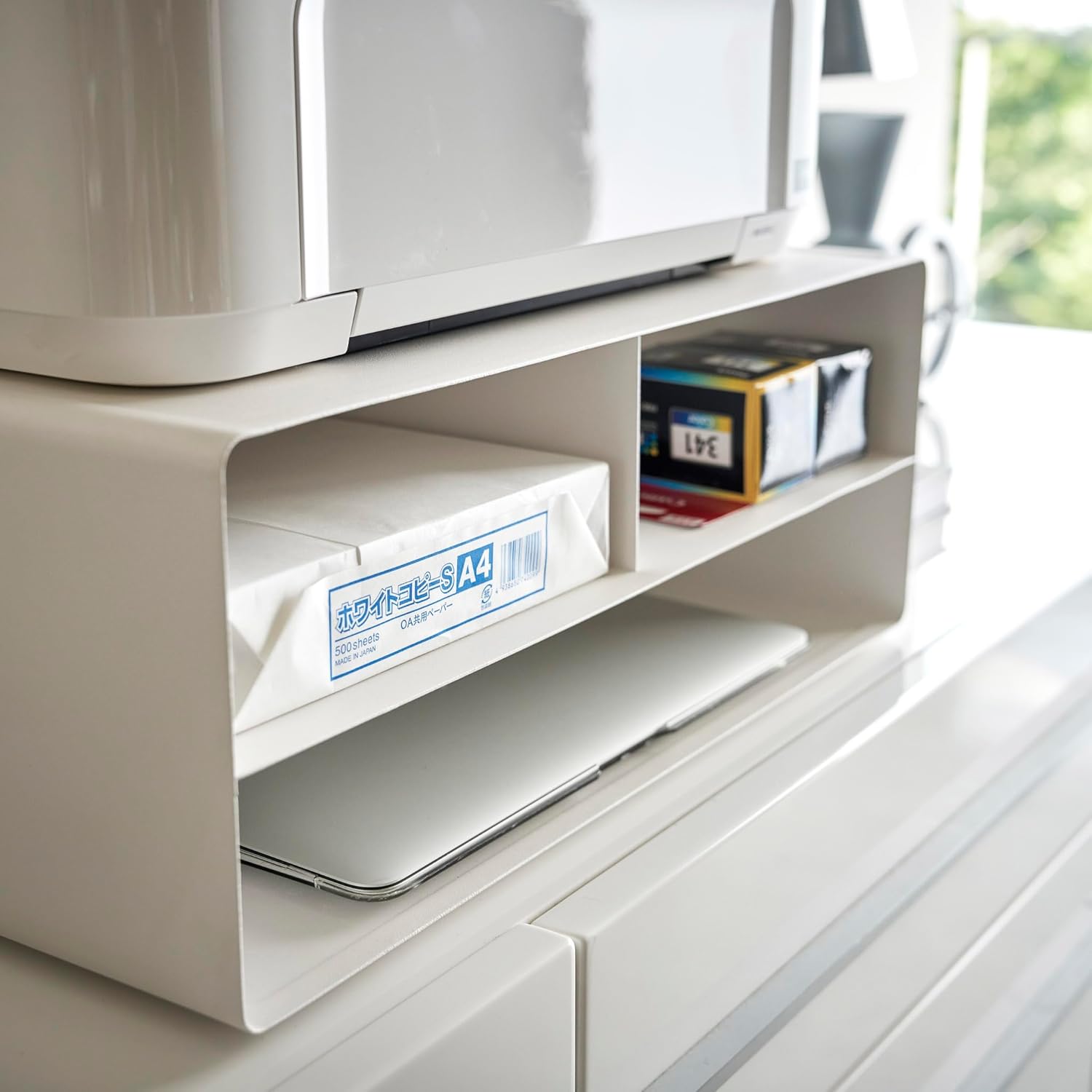 - Die oberen Fächer sind für Papier im Standard Letter-Format (US) 21,6 x 28 cm ausgelegt. In der unteren Ablage können Sie Standard-Ledger-Papierrollen im Format 21,6 x 43,2 cm aufbewahren.