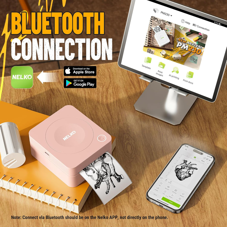 Nelko Aufkleber Drucker, PM230 Mini Drucker Bluetooth Portabel Sticker Maker mit 3 Rollen Papier, fü