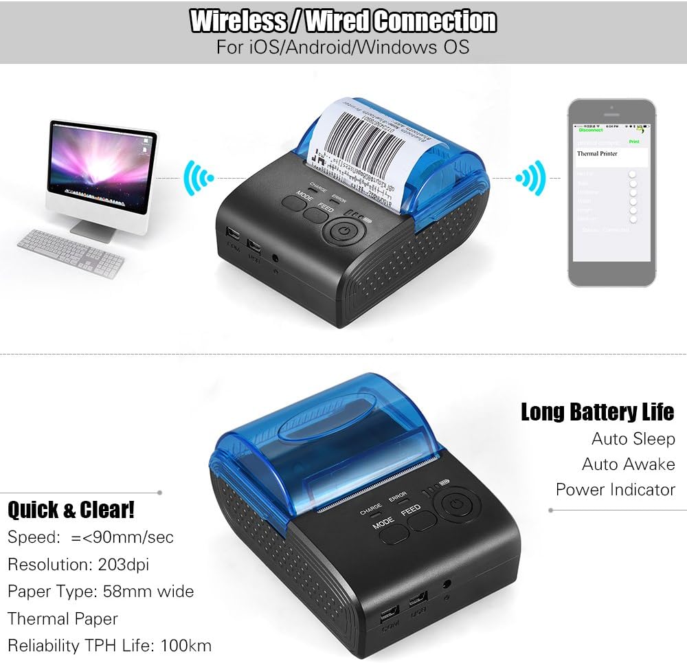 Thermodrucker Bondrucker 58mm, Bluetooth 4.0 Wireless Quittungsdrucker ESC/P0S/STAR Befehlen Drucker