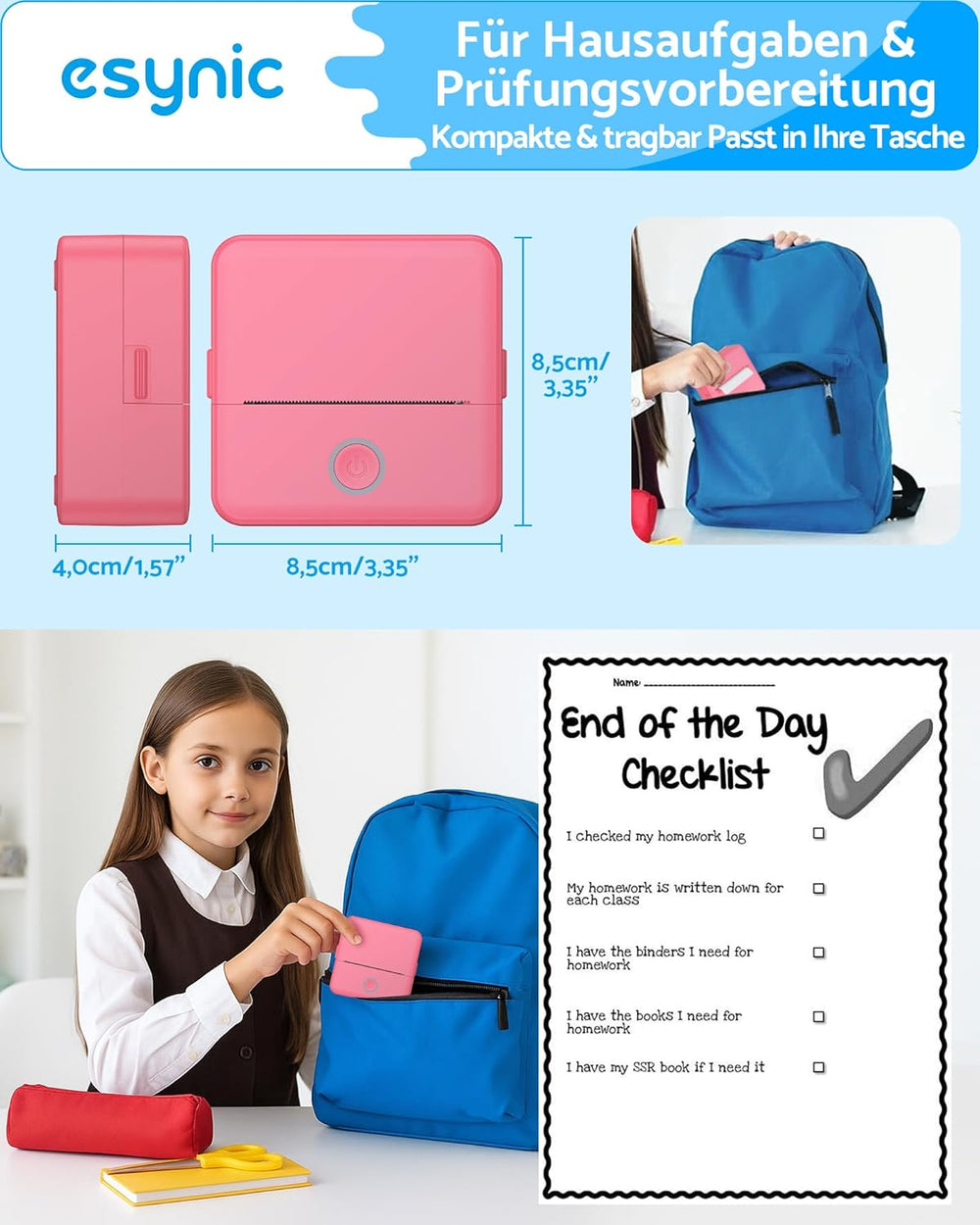 eSynic Mini Drucker – 200 DPI Thermodrucker Bluetooth Drucker für Smartphone, Kompakt und Tragbar, K