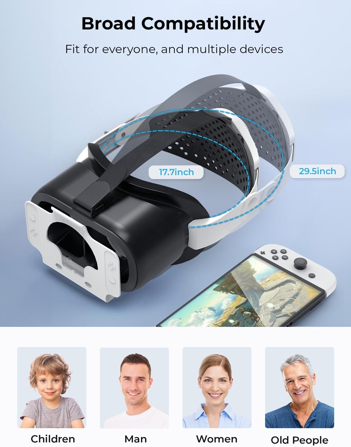 - Ergonomisches Design: Der verstellbare Kopfbügel der VR Brille Switch passt sich jedem Kopf an. Auch wenn Sie eine Kurzsichtigkeitsbrille tragen, ist die glasfreundliche VR Switch Brille verfügbar. Sie an allen Switch-VR-Brillenausschnitten für die
