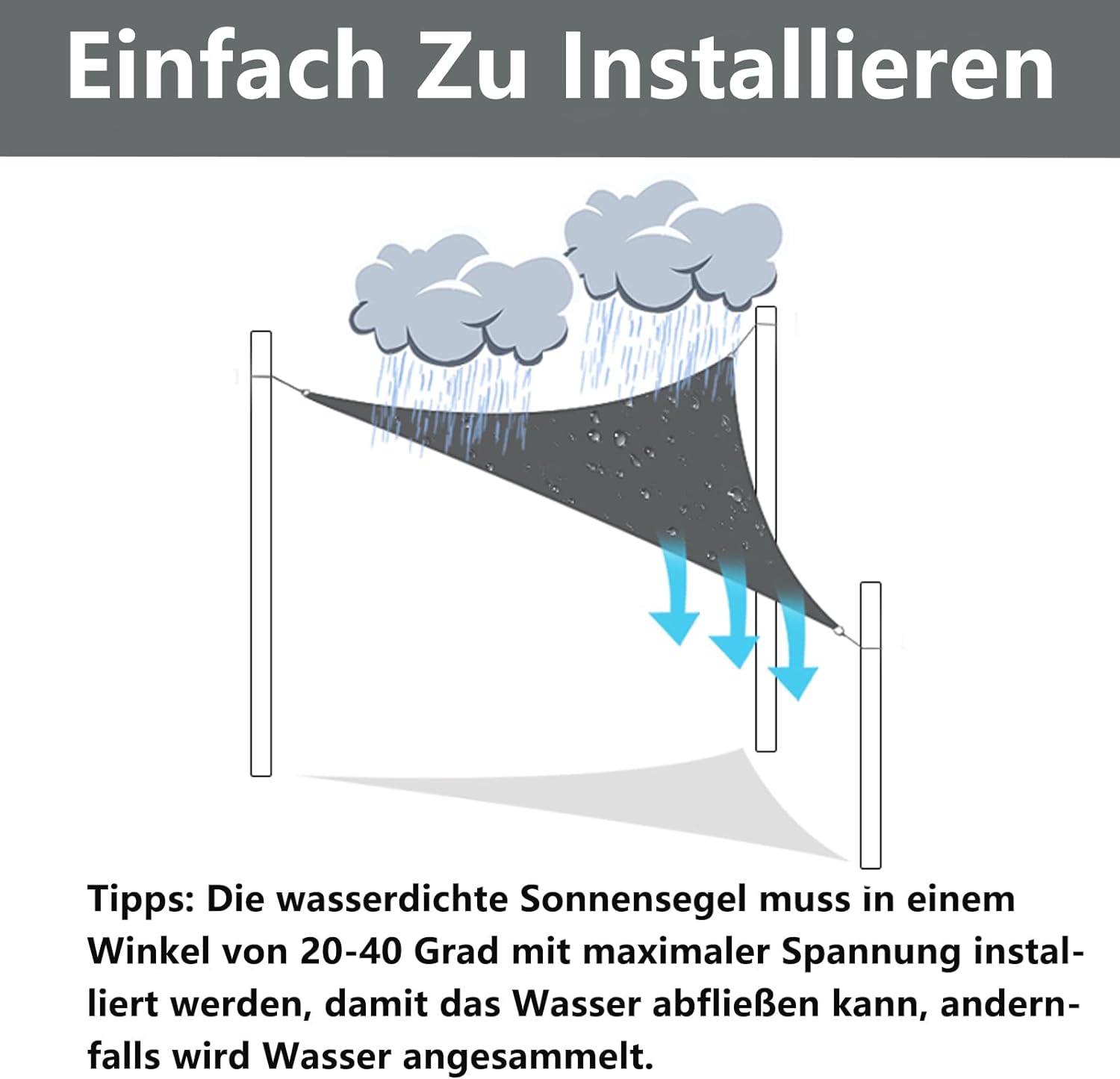 - 【Einfach zu installieren】 Messen und reinigen Sie den Bereich, in dem das Sonnensegel installiert werden soll. Lassen Sie zwischen dem Befestigungspunkt und dem Sonnensegel eine Zugabe von 0,5 - 60 cm, um an Hardware/Haken oder Seile zu passen. Gebogene Seiten, um die Zugkraft zu verbessern und ein Herunterfallen zu verhindern, so dass der tatsächliche Schattenbereich leicht schrumpfen würde, Toleranz 10 - 15 cm für jede Seite.