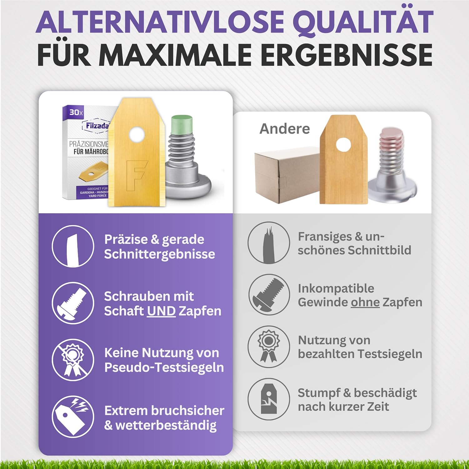 - GLATTES SCHNITTBILD: Durch die Stärke von 0,75 mm und einem Gewicht von 3 g erzeugen die Filzada Ersatzmesser für Automower ein durchgehend gleichbleibendes und glattes Schnittbild. Die Achslast wird durch das etwas höhere Gewicht NICHT beeinträchtigt!
