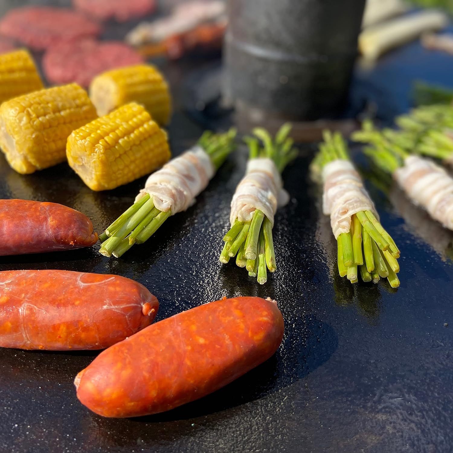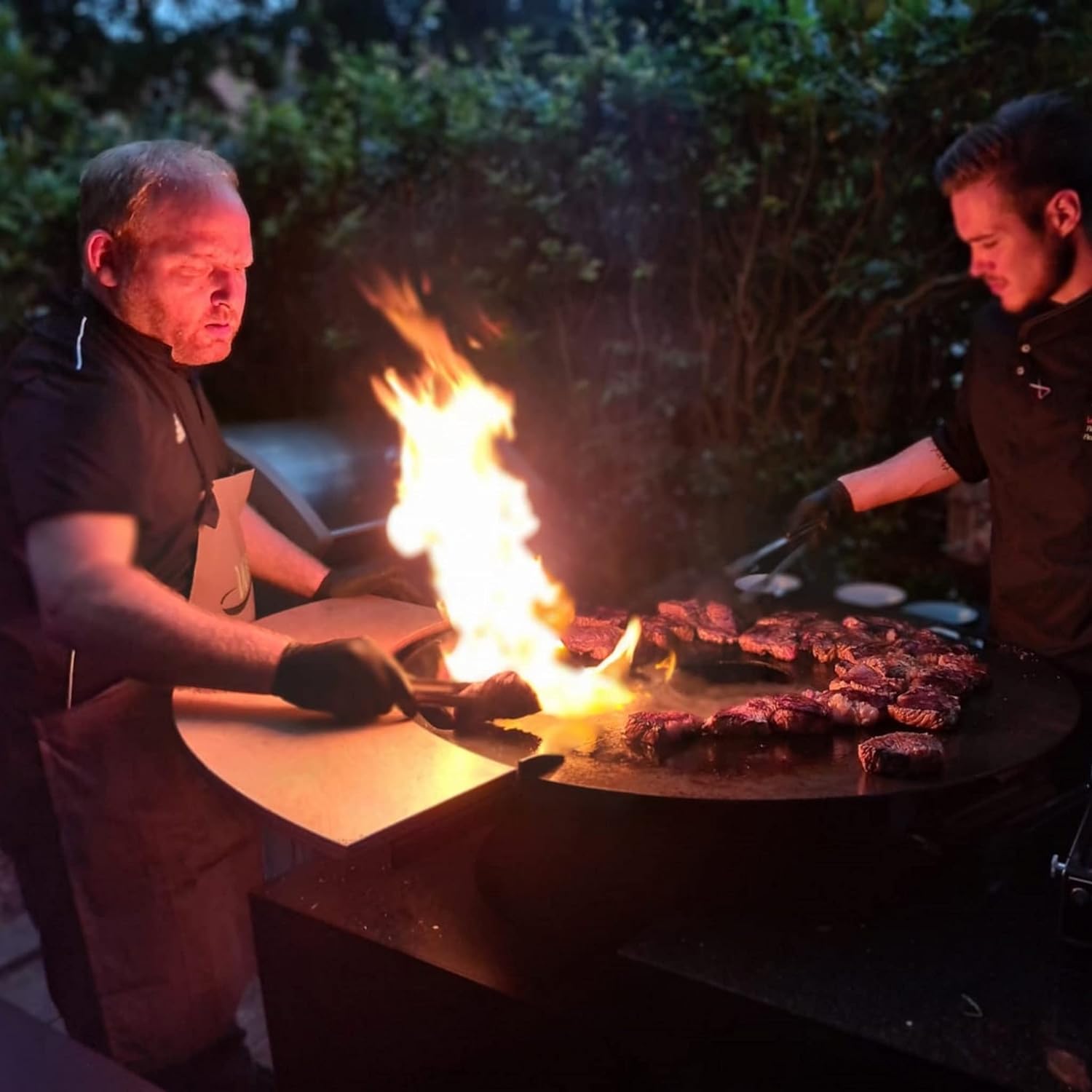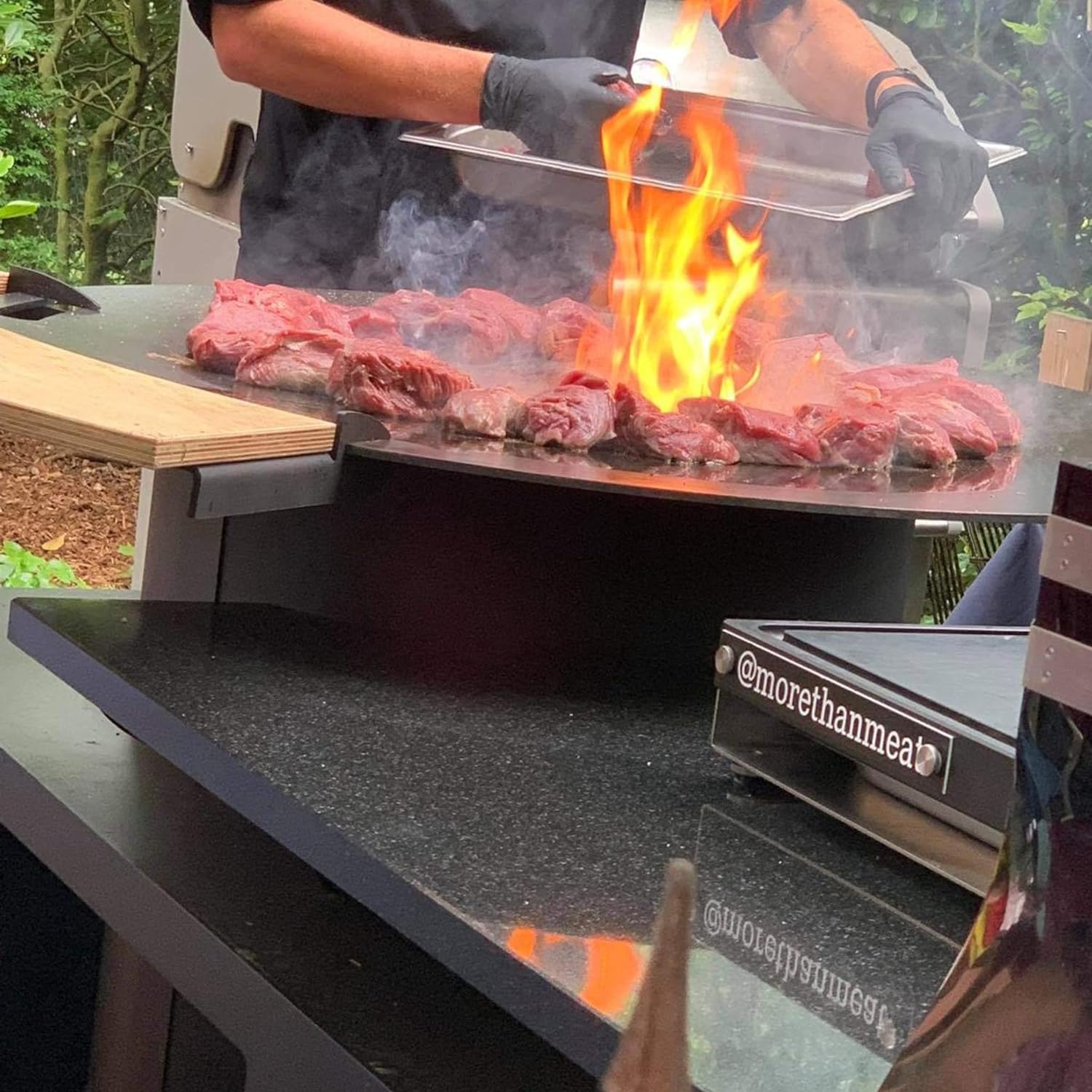 - Bitte beachten, das Feuerplatten vor dem ersten Gebrauch eingebrannt werden müssen. Durch das Erhitzen der Feuerplatte wölbt sich der Stahl wohlwollend in eine Trichterform nach unten, sodass der Fleischsaft gewollt ins offene Feuer läuft.