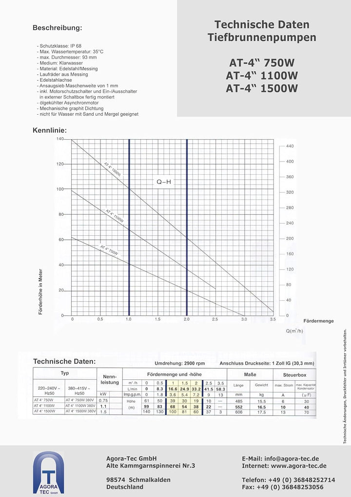 - geeignet für sehr tiefe Brunnen mit einen Ø von 100mm, alle wasserführenden Teile aus Edelstahl und Messing, ein Laufrad aus Messing, hochwertiges Edelstahlgehäuse und Messingteilen
