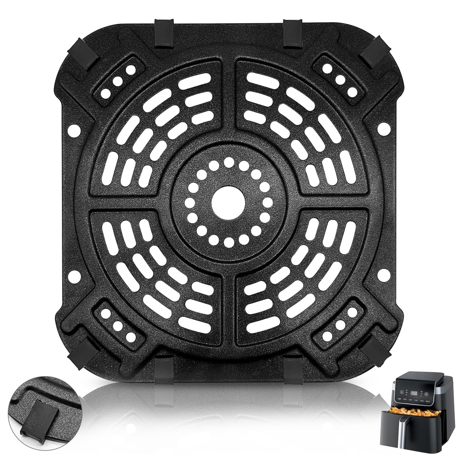 - Lieferumfang: 1 x Luftfritteusen-Grillplatte, 1 x magisches Reinigungstuch, 8 x Gummi-Stossdämpfer.