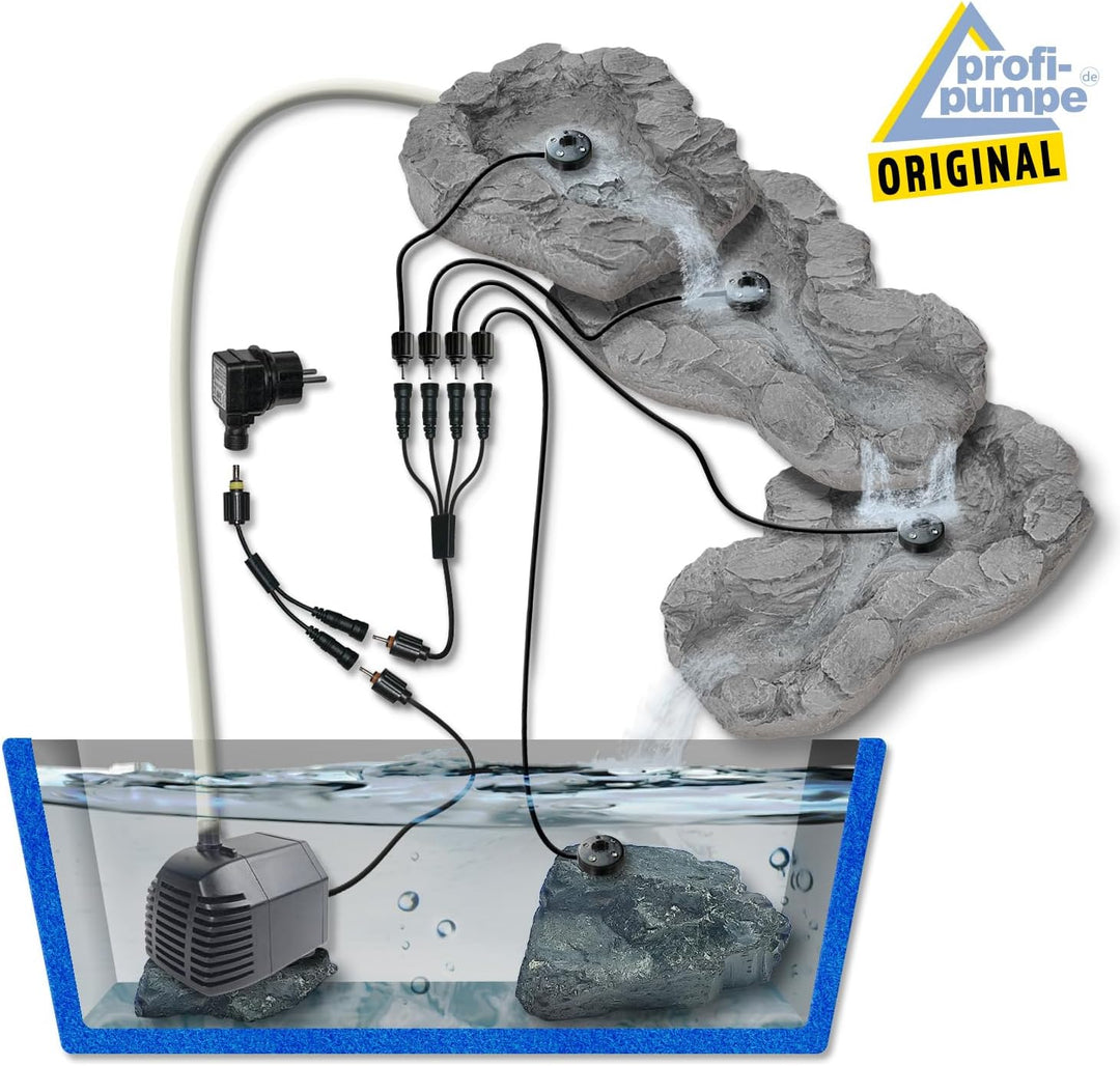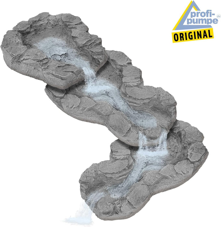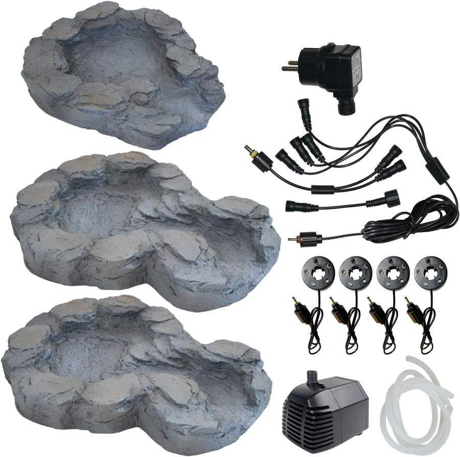 - Komplett-Set: Gartenbrunnen BACHLAUF QUELLBACH II 3-teilig mit 3 Schalen in NATURGETREUER STEIN-OPTIK, 230V-Tauchpumpe, LEDs mit FARB-EFFEKTEN und allem Anschluss-Zubehör