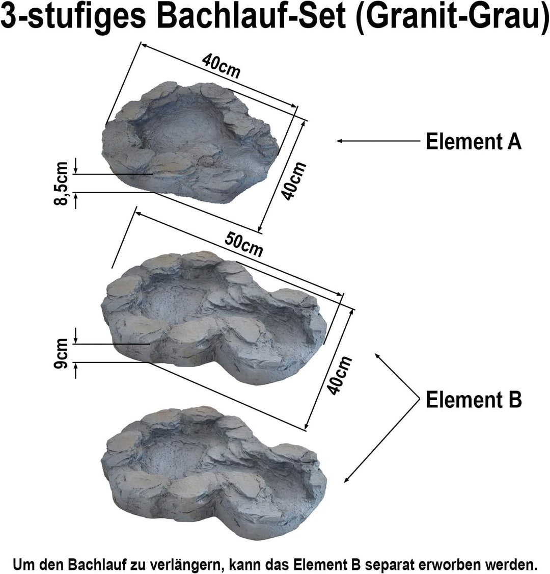 - Inkl. 3 Schalen: Obere Schale mit Pumpenanschluss (L52 x 42x H8,5 cm) und zwei grossen Erweiterungsschalen (je L41 x W41 x H8,5 cm) aus wetterfestem POLYRESIN