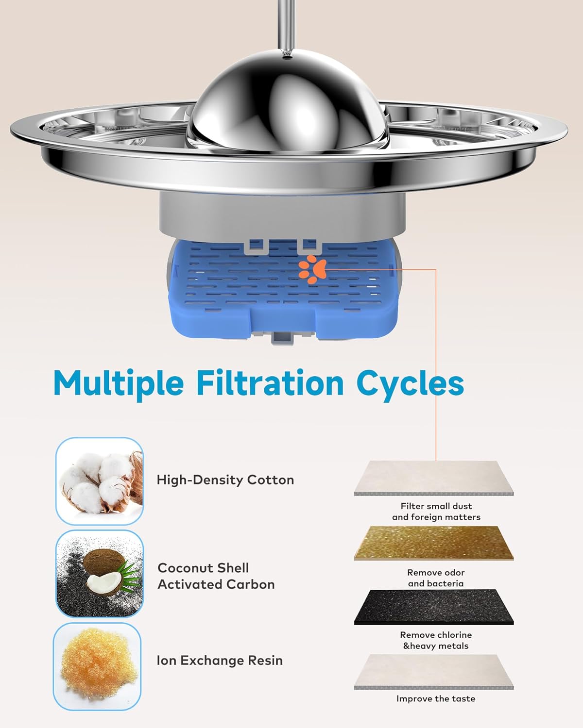 - 【Vierfaches Filtersystem】Der Vorfilter dieses Katzenbrunnens besteht aus einem Schwamm, um grössere Verunreinigungen wie Haare und Futterpartikel vorzufiltern, und einem Tiefenfilter, der aus einer Baumwollschicht, Aktivkohle und Ionenaustauschharz