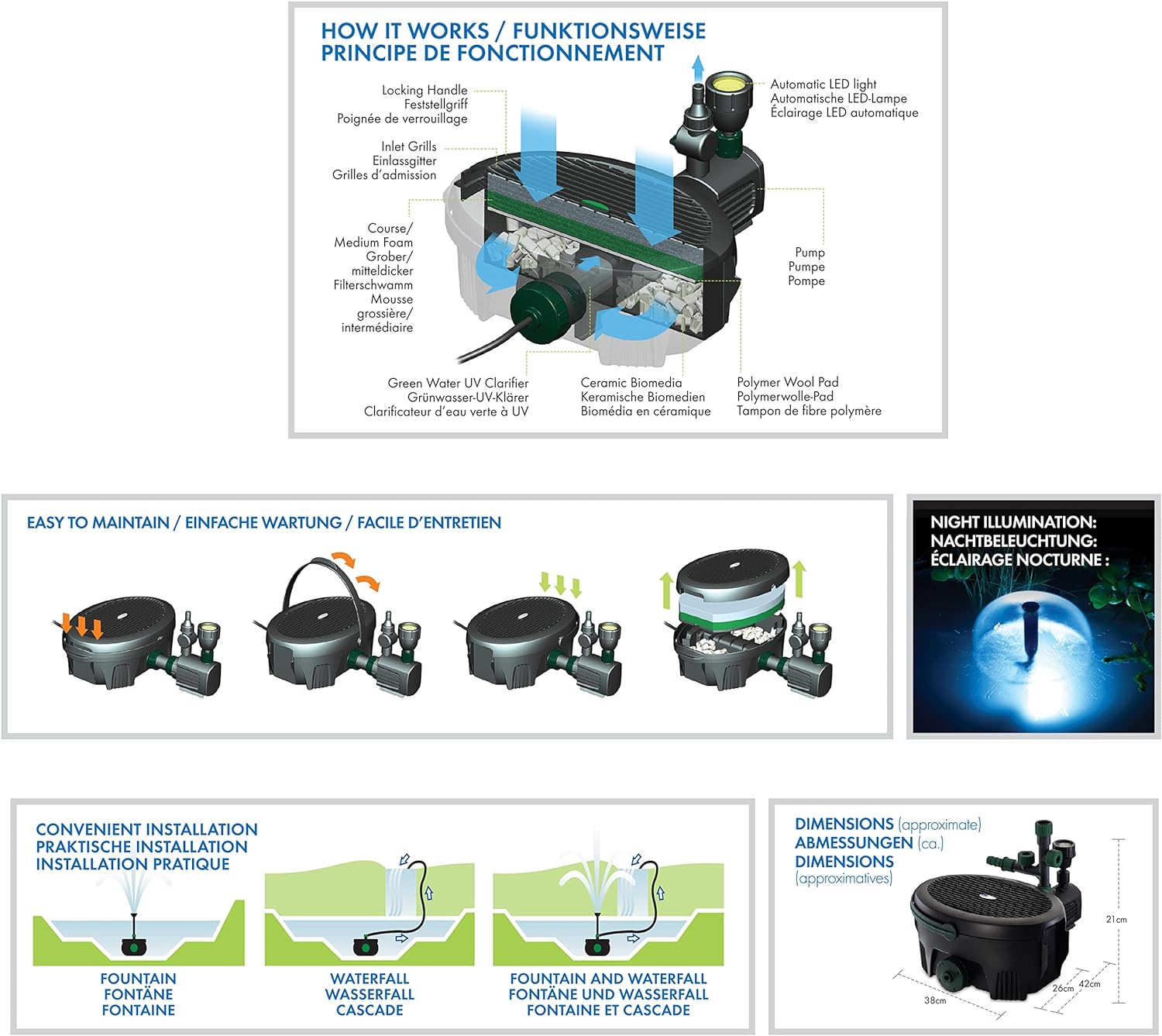 - LED-STRAHLER: Der integrierter LED-Strahler schaltet sich in der Nacht automatisch ein, sodass Sie Ihren Teich rund um die Uhr bewundern können.