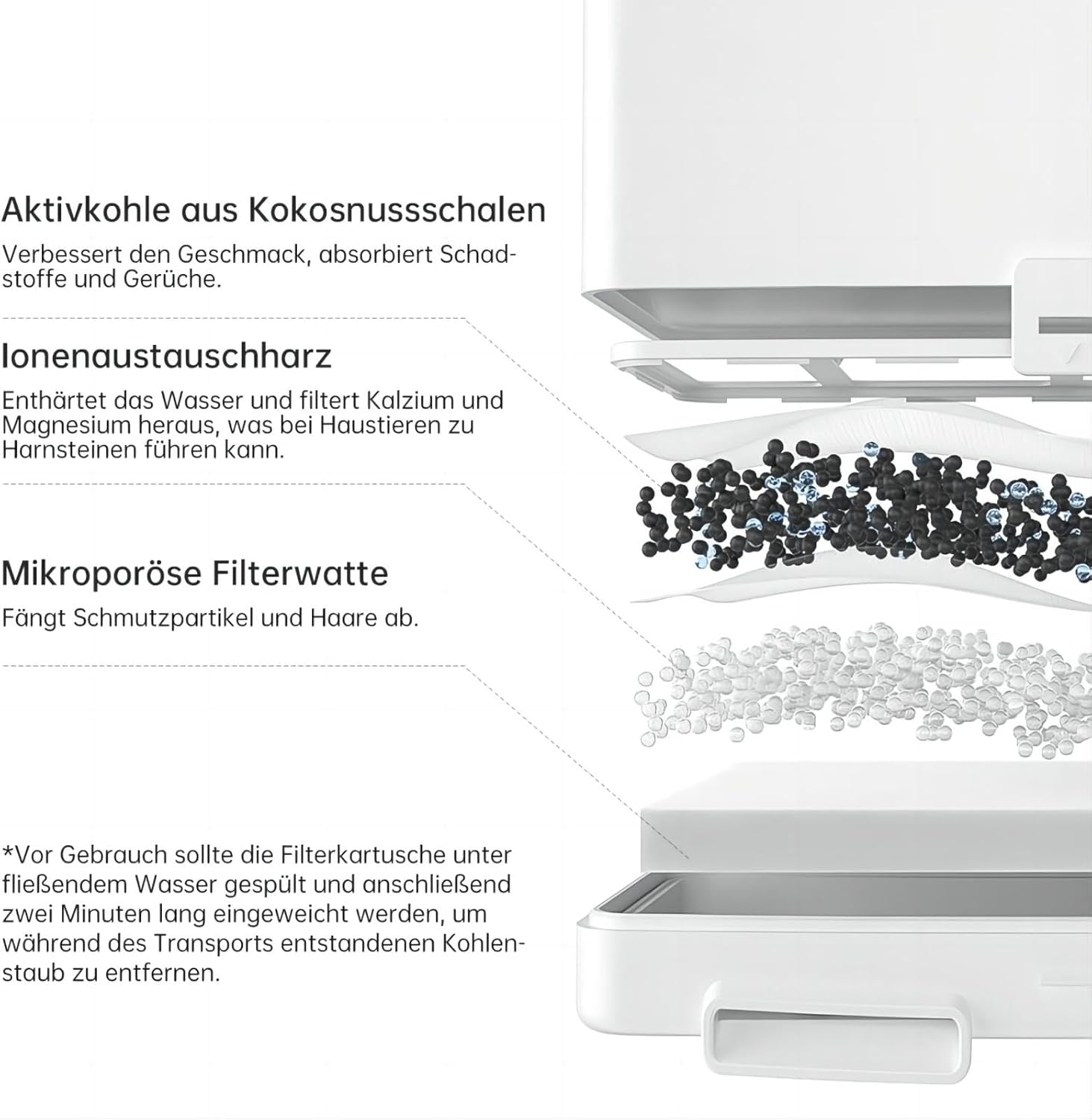 - [Verwendung]: Weichen Sie den Filter vor dem Gebrauch zwei Minuten lang in Wasser ein, und setzen Sie sie dann in der richtigen Richtung auf den Trinkbrunnen.