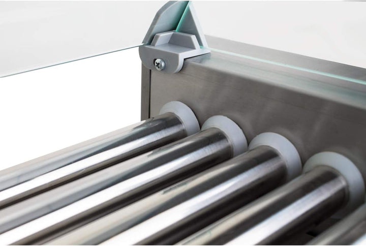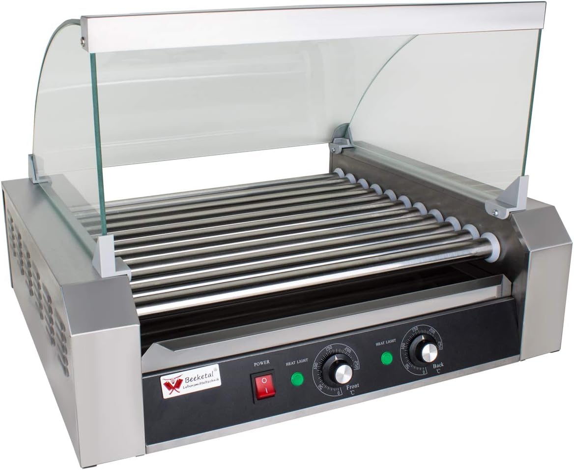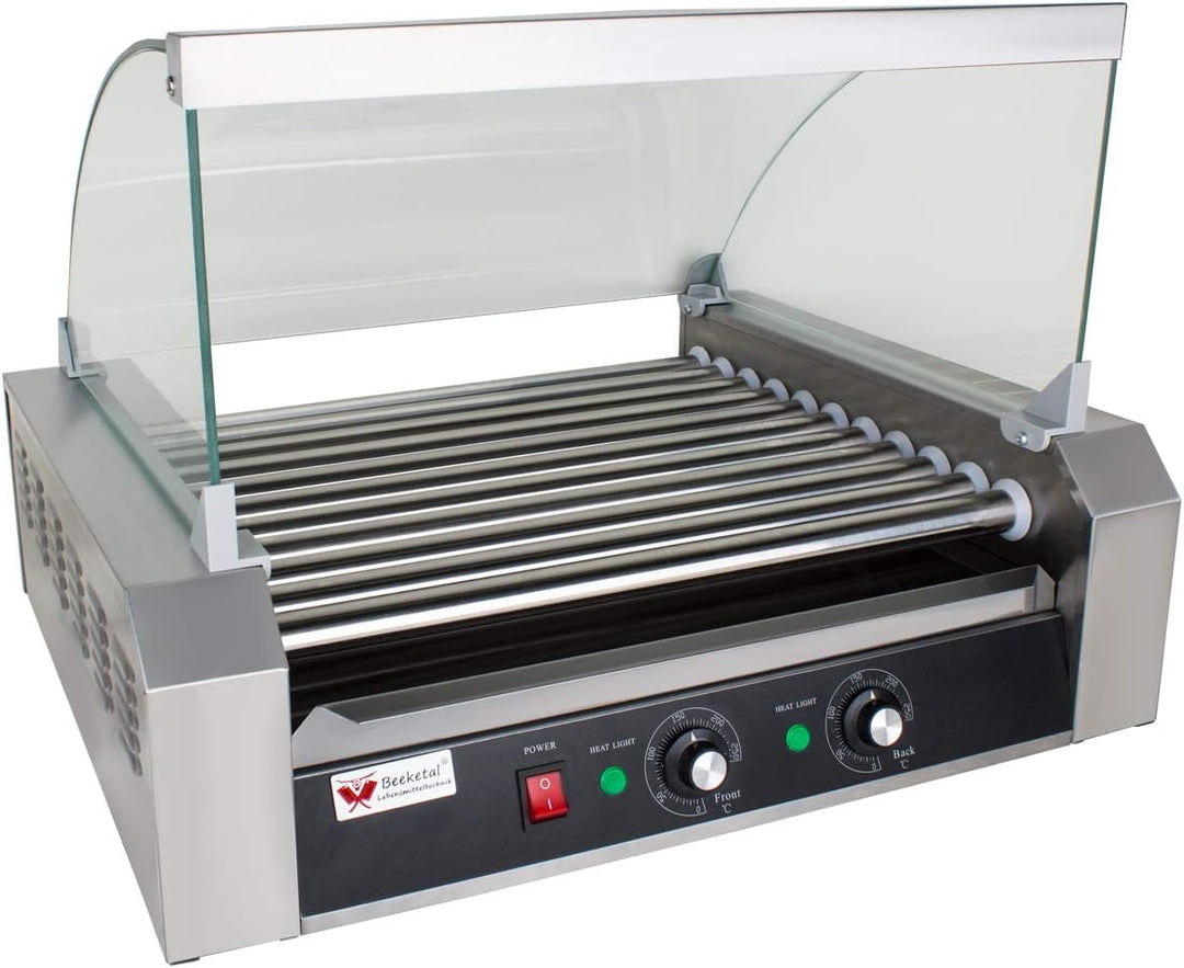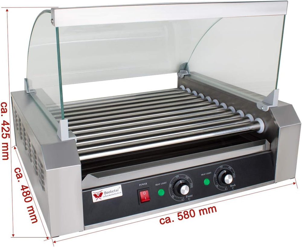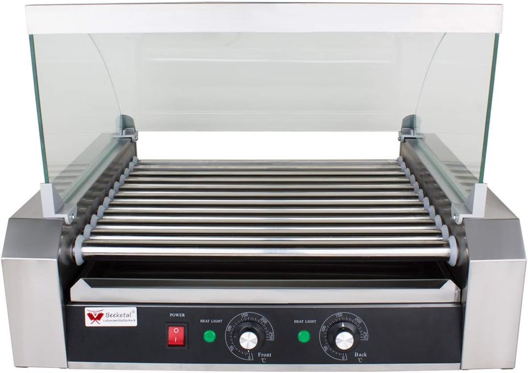 - 2 Zonen Profi Elektro Hot-Dog Grill Gerät mit 11 rotierenden Heizstäben aus Edelstahl, Glas Abdeckhaube und extra Fettauffangschublade im Gehäuse (Bis zu 20 Würste gleichzeitig grillen)