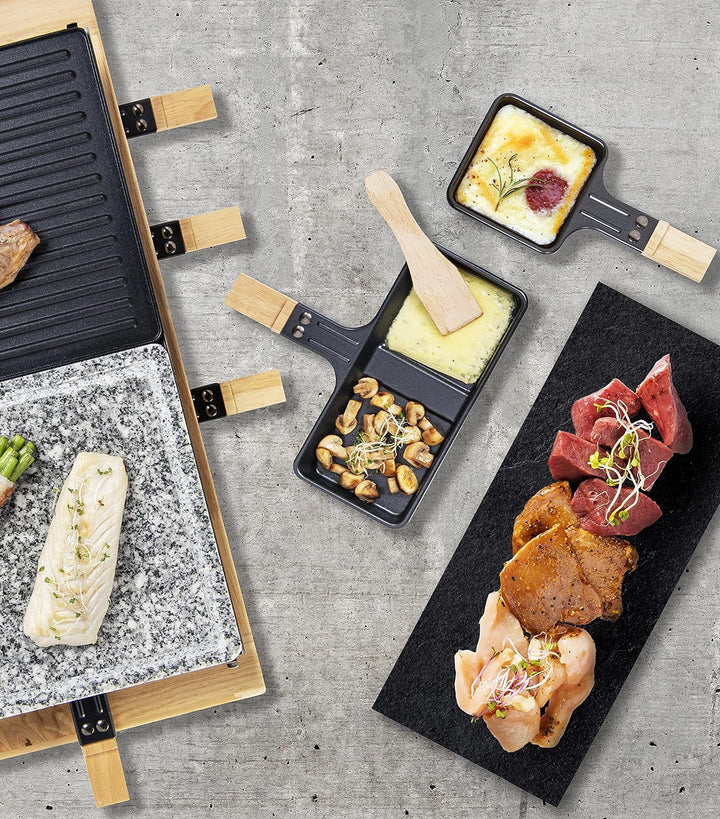 - Grosses Raclette mit Naturgrillstein und Grillplatte für tollen Partyspass für bis zu 8 Personen und direkten Genuss am Tisch im Esszimmer, auf dem Balkon, der Terrasse oder im Garten