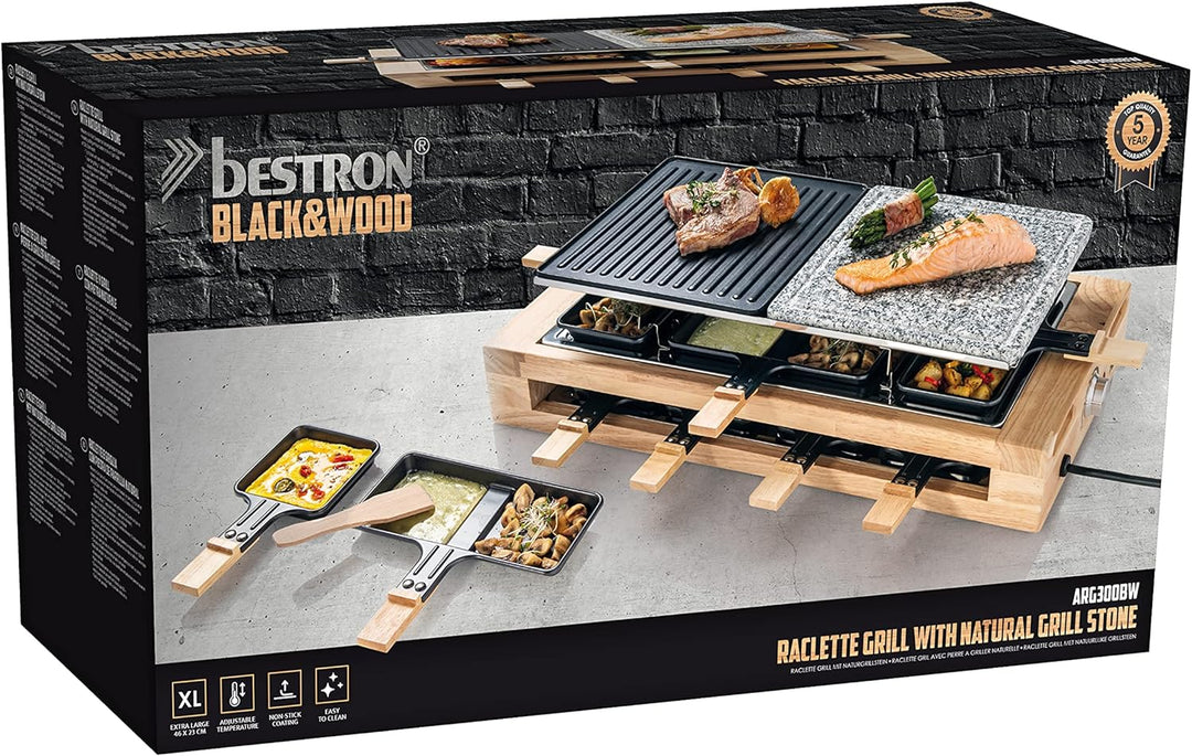 - Lieferumfang: 1 Bestron XL Raclette-Grill, Inklusive 4 Doppel-Pfännchen, 8 Einzelpfännchen & 8 Holzschaber, Black&Wood, Leistung: 1.500 Watt, Masse: 61x21x32 cm, Gewicht: 8 kg, Material: Gusseisen/Kunststoff/Holz, Farbe: Schwarz/Holz, ARG300BW