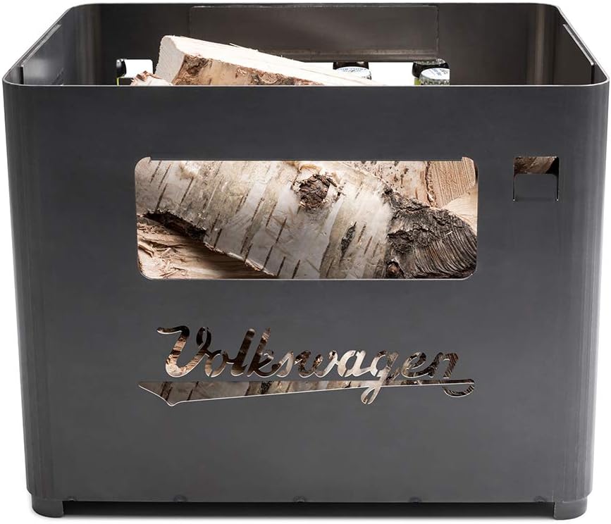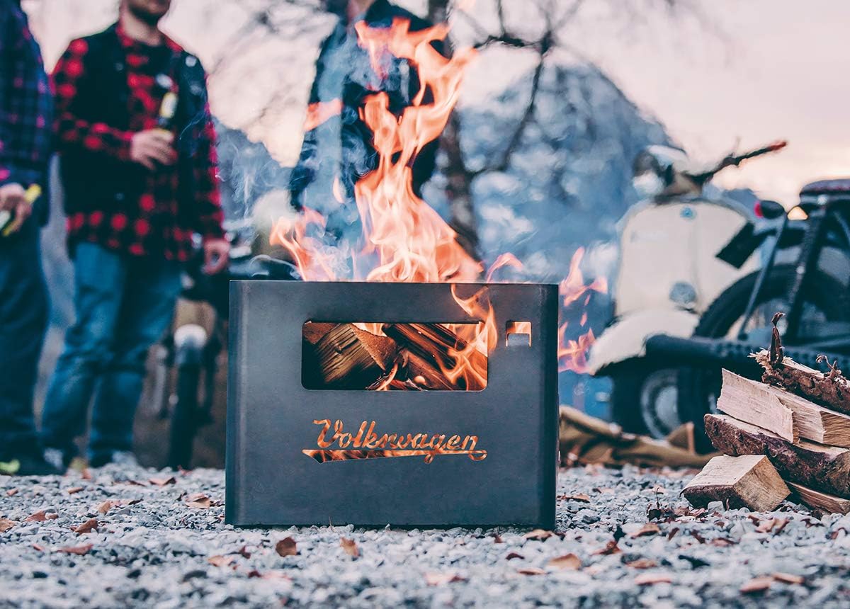 - FEUERKORB Schwarz: hochwertiger Feuerkorb in Schwarz mit der Form einer Getränkekiste, mit ausgelaserten Elementen wie der VW T1 Bulli Bus und dem Volkswagen Schriftzug. Die bekannten Masse eines Bierkastens von 39 x 27 x 30 cm wurden gewahrt.