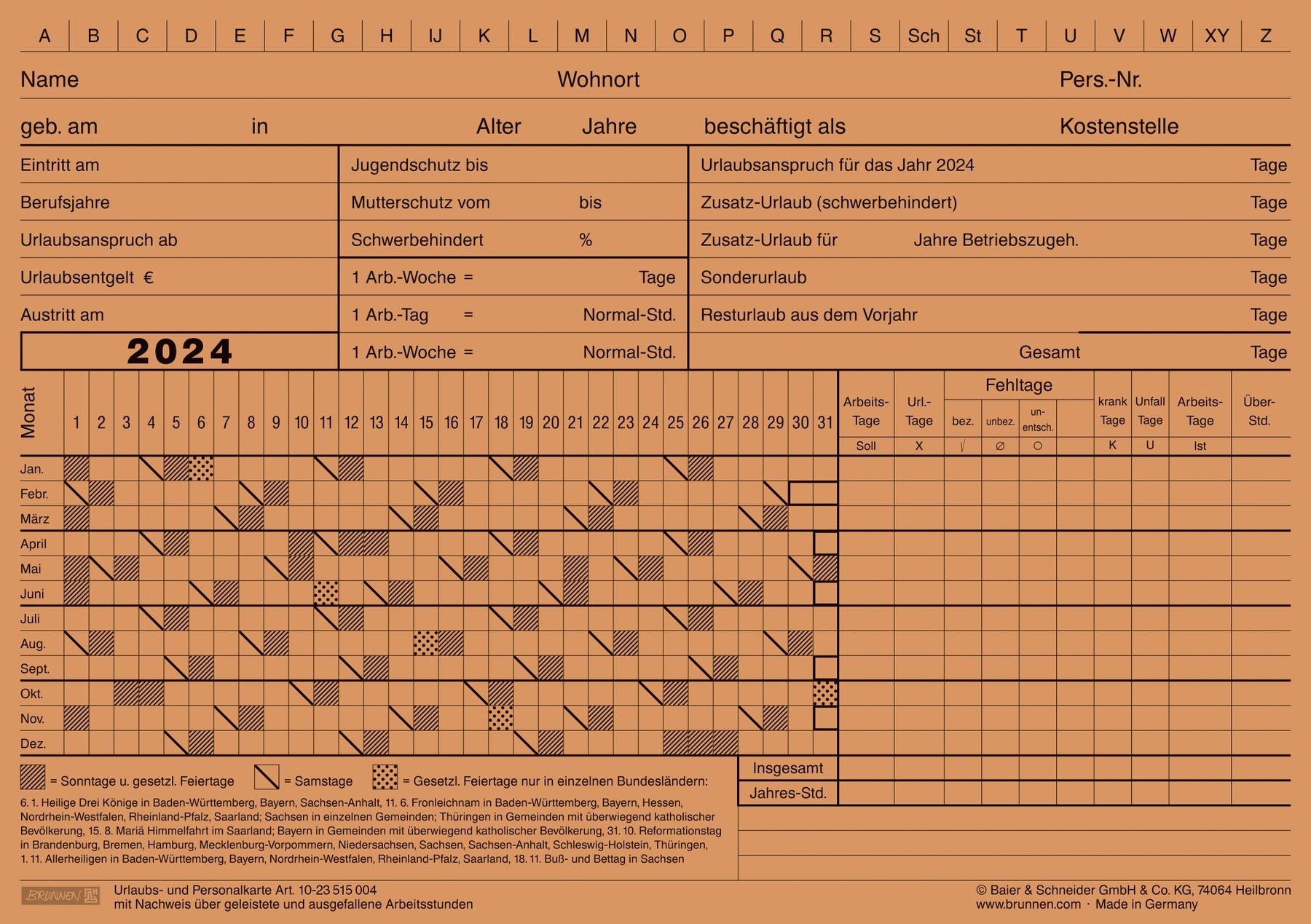 - mit jahresgebundenem Kalendarium, Vorderseite Urlaubsvordruck, Jahreskalendarium mit Kennzeichnung von Samstagen, Sonn- und Feiertagen, Erfassung von Arbeits-, Urlaubs-, Krankheits- und Fehltagen. Rückseite mit Vordruck für Personalangaben: Daten zur