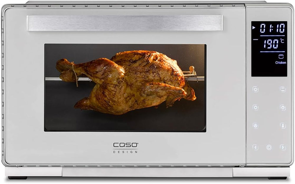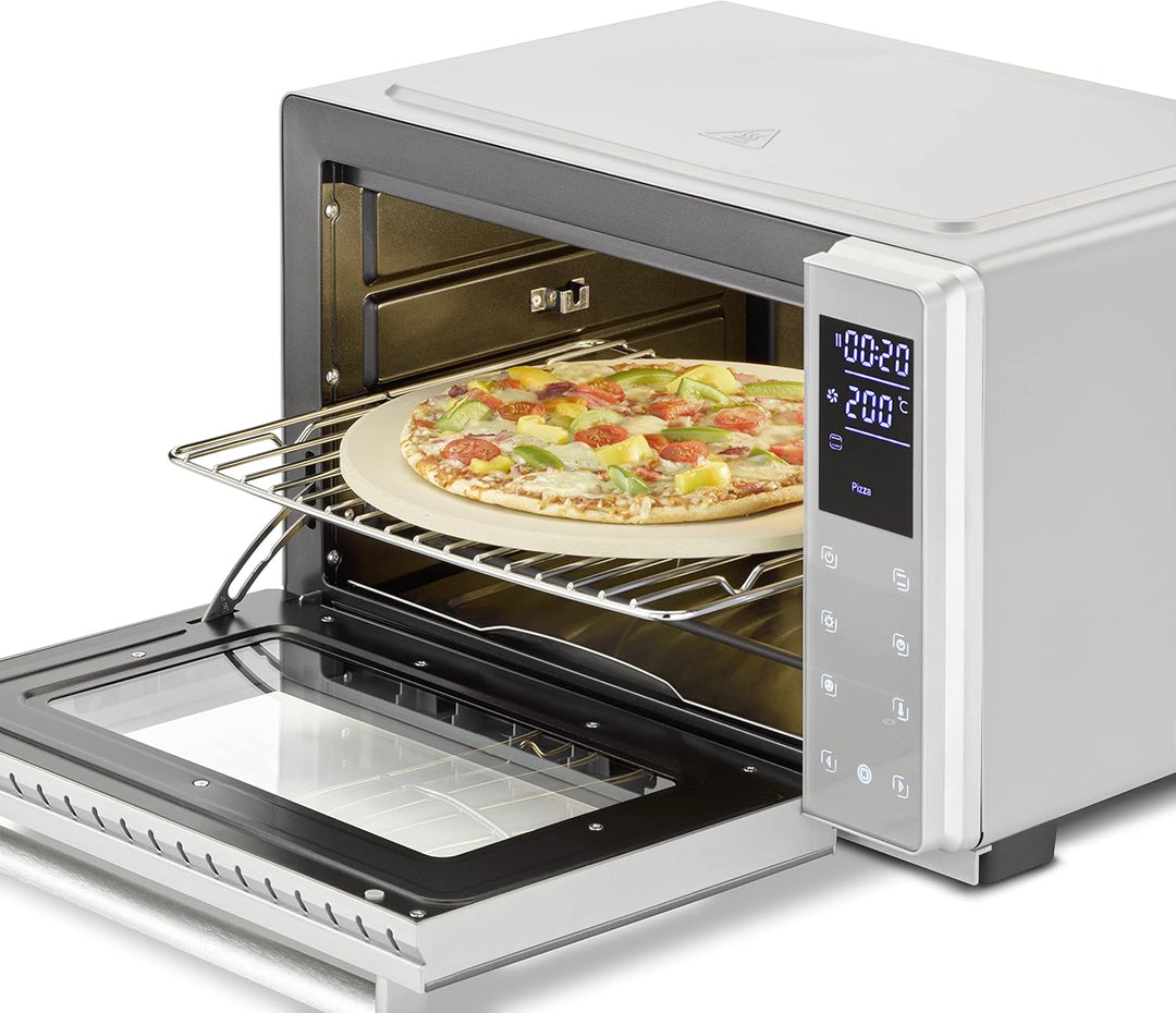 - 🍗 UMFANGREICHER LIEFERUMFANG: Der Lieferumfang dieses Backofens umfasst einen Grillrost, einen Drehspiess, ein Backblech, einen Pizzastein mit einem Durchmesser von 30 cm, eine entnehmbare Krümelschublade aus Edelstahl sowie eine praktische