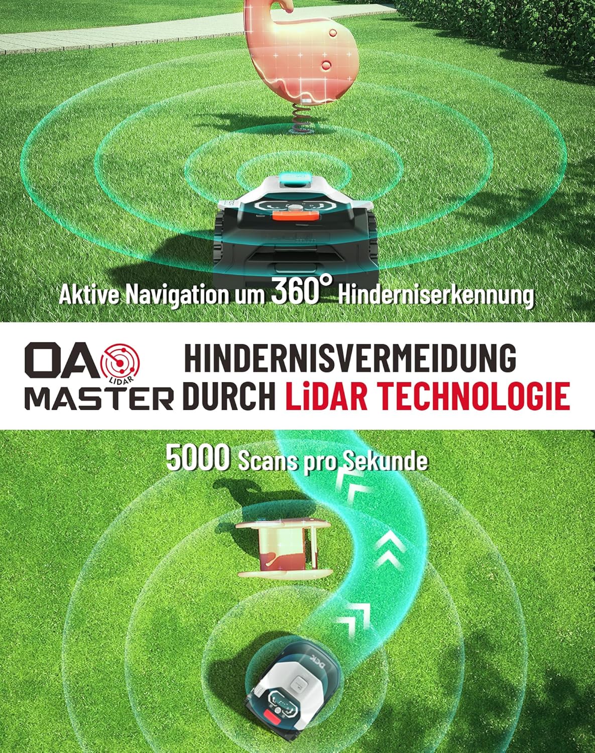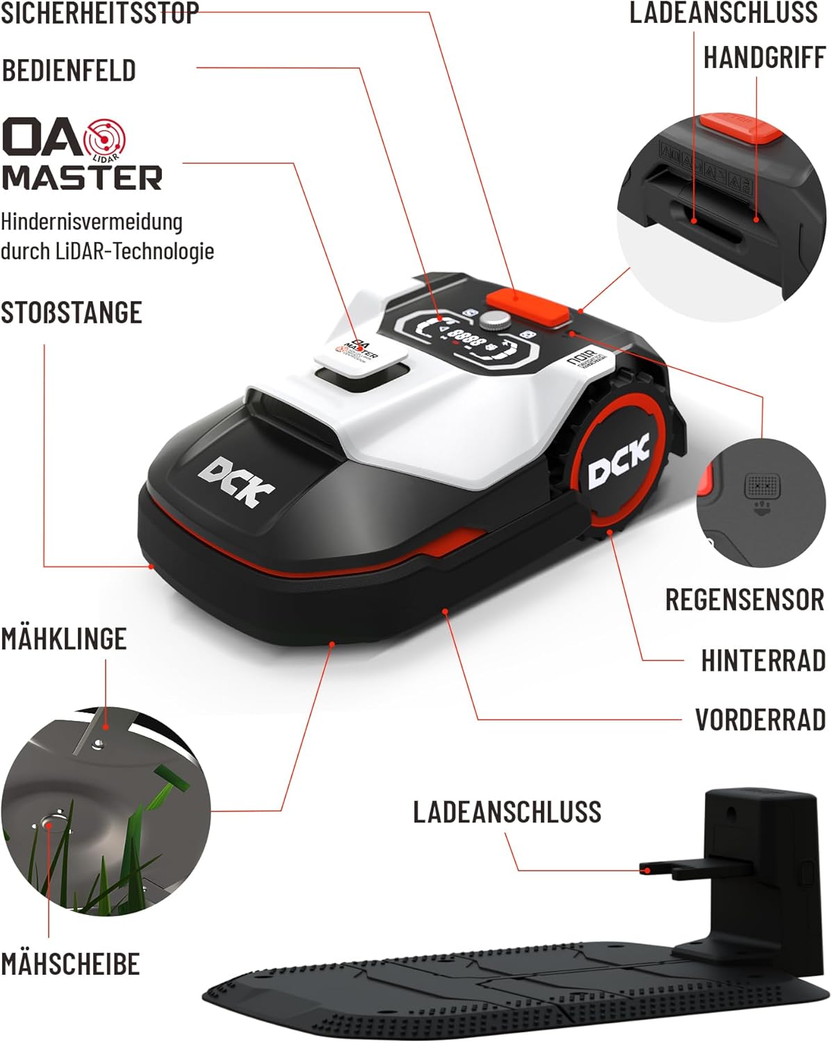 - Doppelte Sicherheit-Vorausschauende Hindernisvermeidung: DCK Rasenmäher ist mit Lidar ausgestattet,die mit einer Rate von 5000/s und einem 360°-Scan Hindernisse im Voraus erkennt und sie mit millimetergenauer Präzision umgeht.So wird