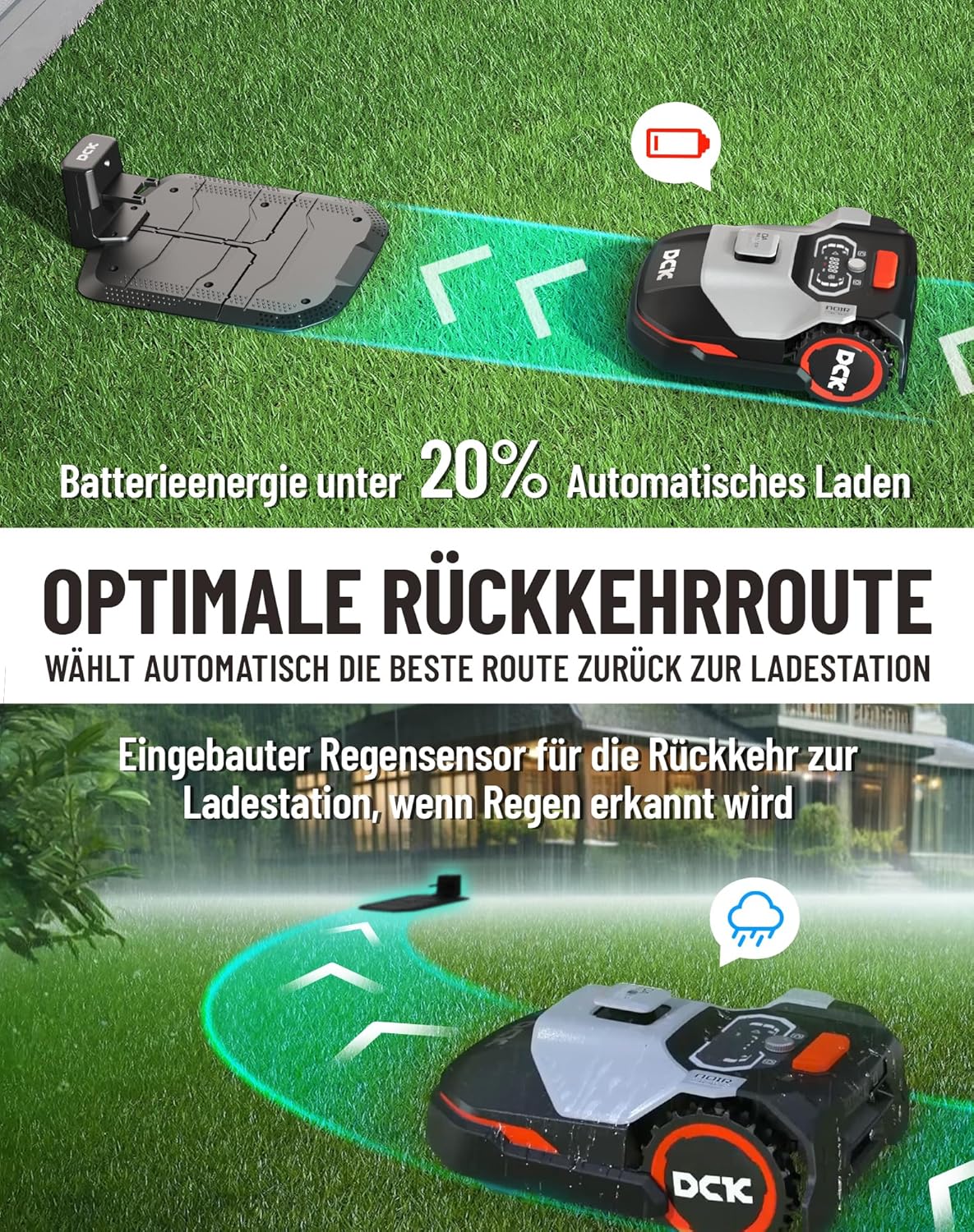 - Optimaler Rückweg: Im Gegensatz zu anderen Robotern, die entlang der Begrenzungslinie zurückkehren, kann der DCK Rasenroboter automatisch den optimalen Rückweg zur Ladestation berechnen, ohne dass eine Führungslinie erforderlich ist, was sowohl Zeit