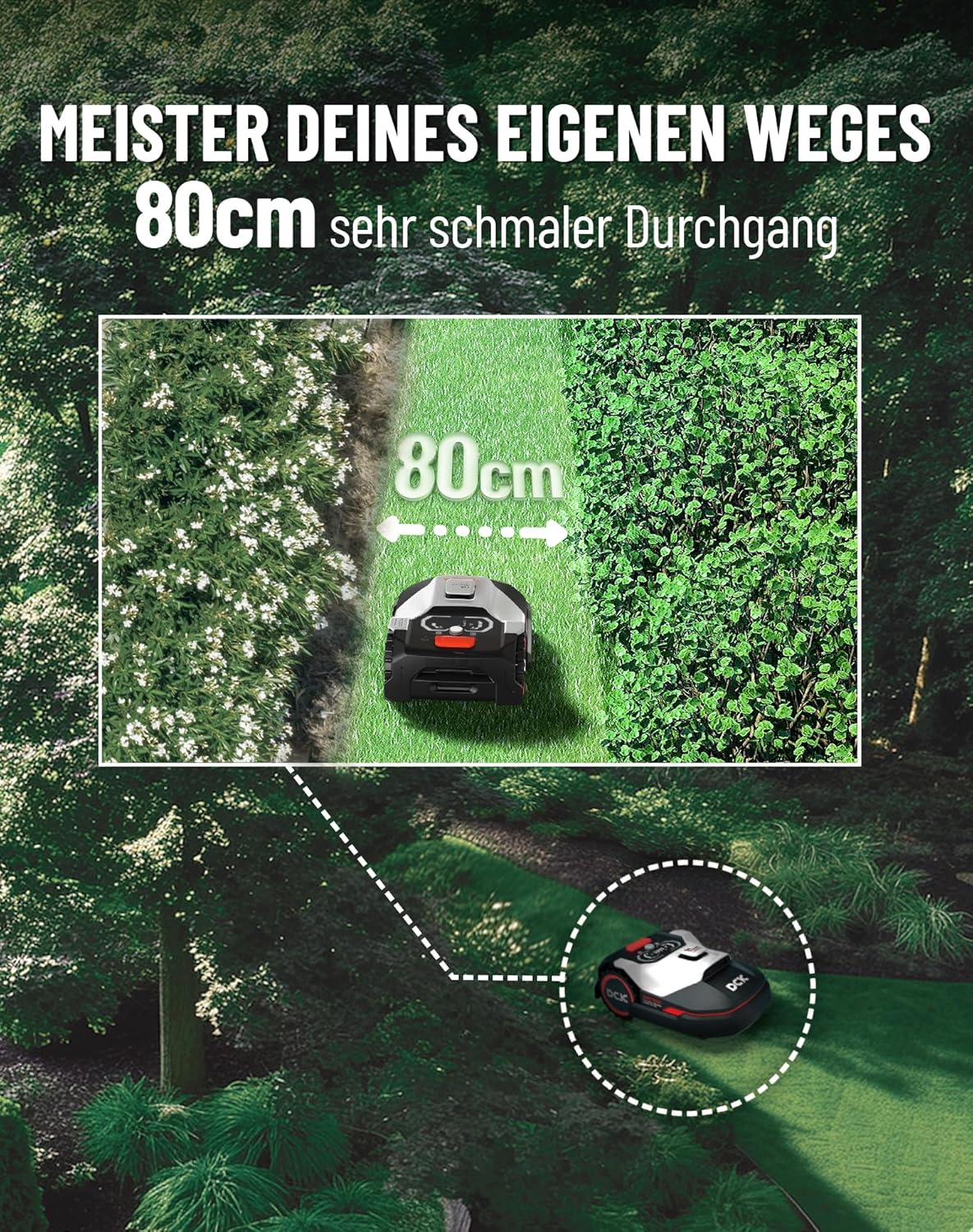 - "Mehrzonen-Mähmodus: Der Automatischer Rasenmäher kann durch 80 cm breite Wege navigieren und ist für Steigungen bis zu 40 % geeignet. Er ist ideal für komplexe und unregelmässig geformte Gärten. Sie können die Zonen personalisieren, um die