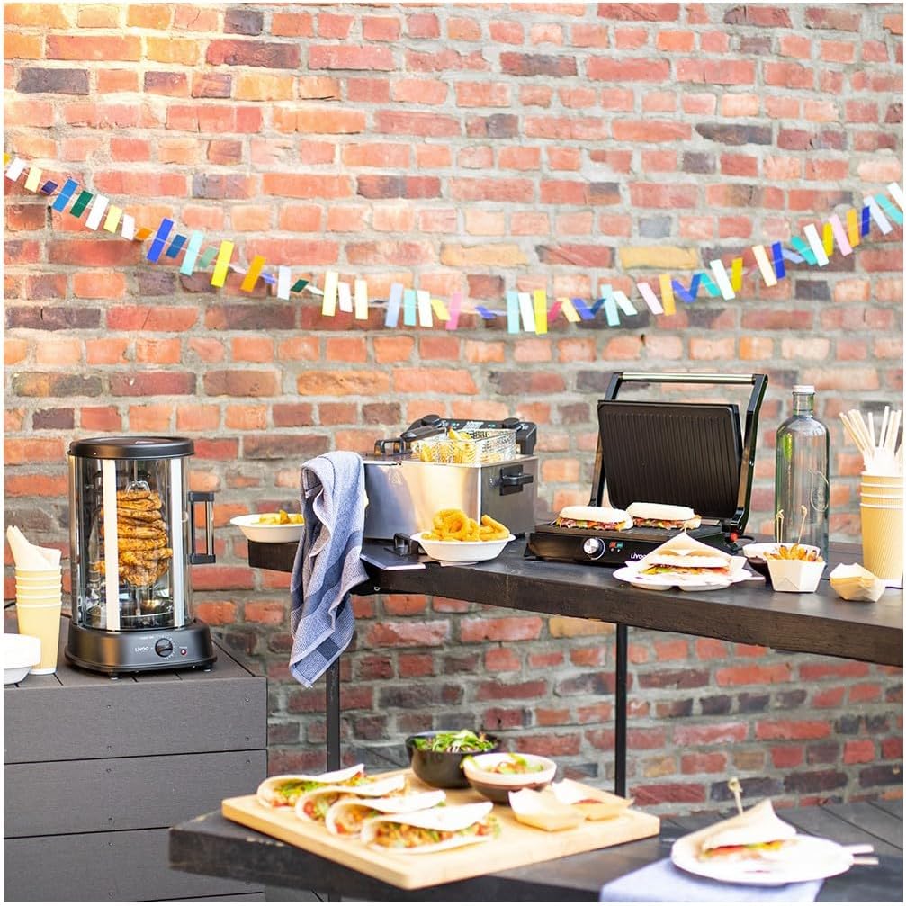 - Produktbeschreibung: Grill passend für Fleisch, Geflügel und kebab, bis 2,5 Kg oder gyros und Spiesse, 1-polig, 10 Spiesse zentrale 23 cm, 360° drehbar, Widerstand in horizontalen Ohrringe sorgt für eine gleichmässige Hitzeverteilung, Abnehmbare Elemente aus Edelstahl und waschbar im lave- Geschirr, überschüssiges Fett auf