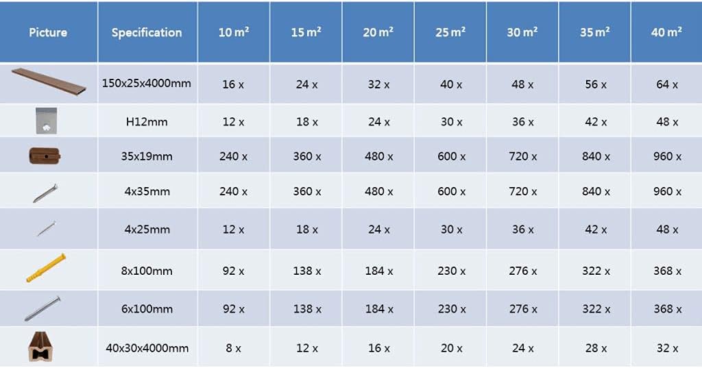 - Die Terrassenfliesen bestehen aus hochwertigem WPC-Die Lieferung umfasst 64 Terrassendielen, 48 Anfang- und Endclips aus Edelstahl, 960 Abstandhalter aus Kunststoff, 960 Edelstahlschrauben (4×35 mm), 48 Schrauben (4×25 mm), 368 Plastikhülsen für