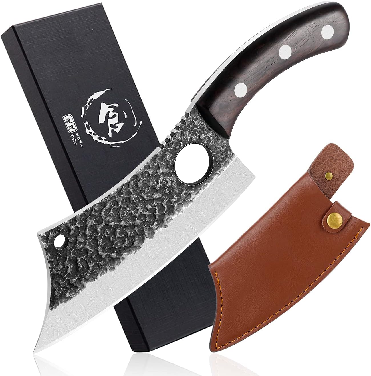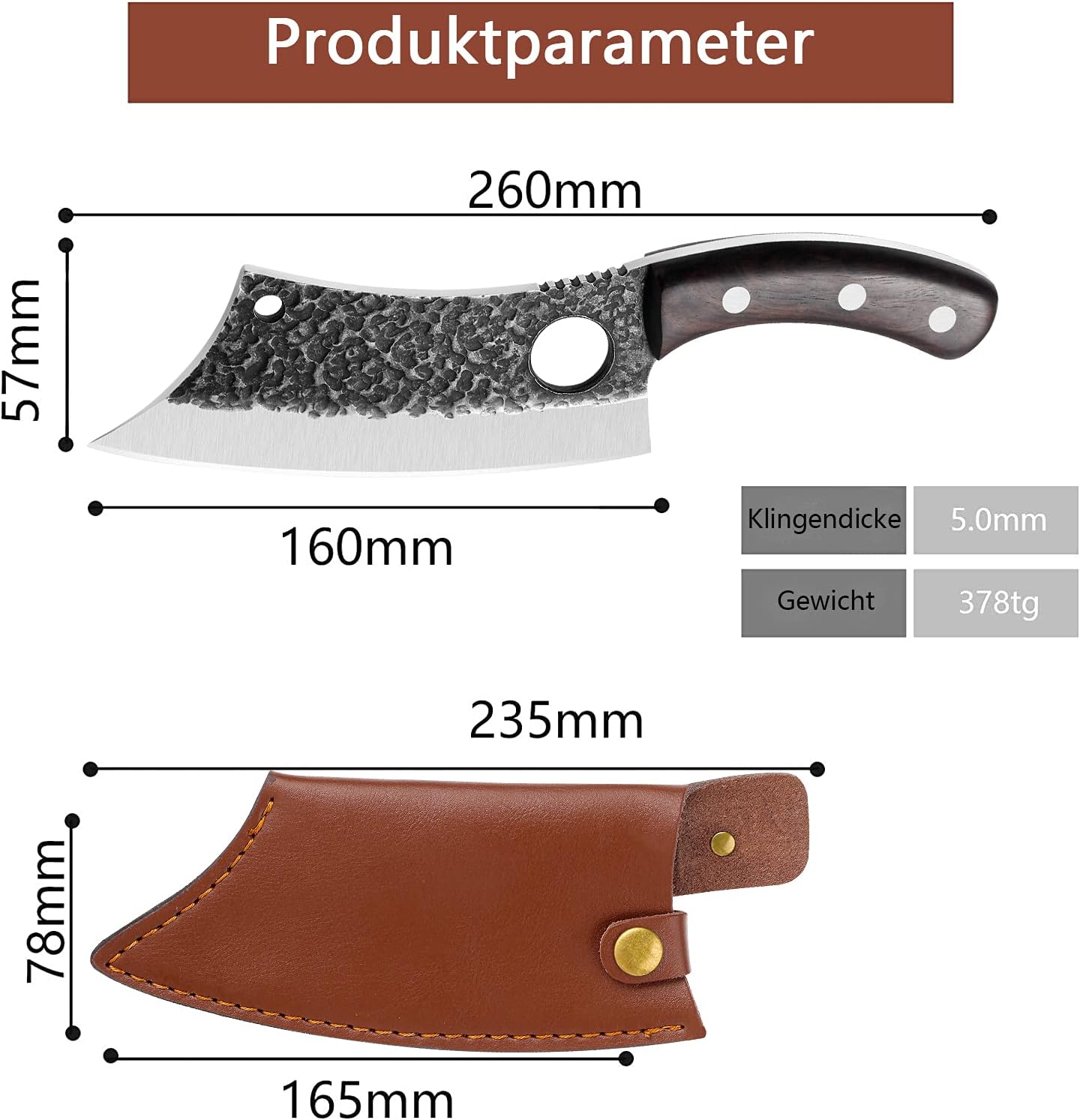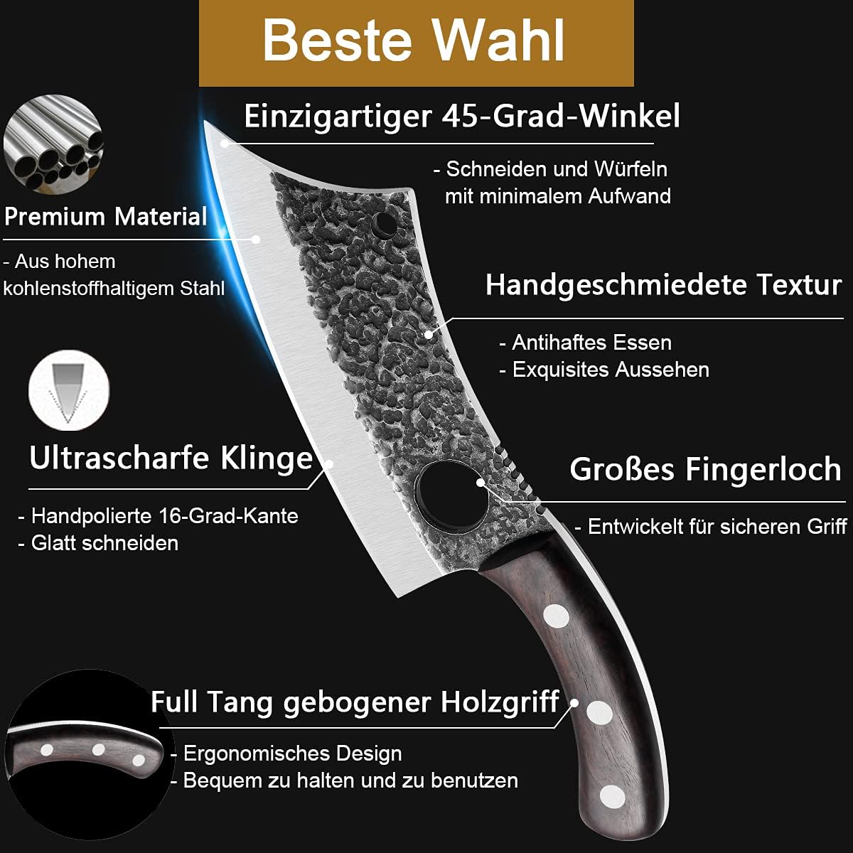 - Ultrascharfe Klinge - Die Klinge ist handgeschmiedet und hat mehrkanalige Verbundverfahren für feines Schleifen und Haltbarkeit bestanden. Speziell gehämmerte Grübchen auf der Oberfläche der Klinge verbesserten die Antihaft-Eigenschaften.Die handpolierte 16-Grad-Kante und die Klingenstärke von 5 mm können Ihnen dabei helfen, problemlos reibungslos zu schneiden.