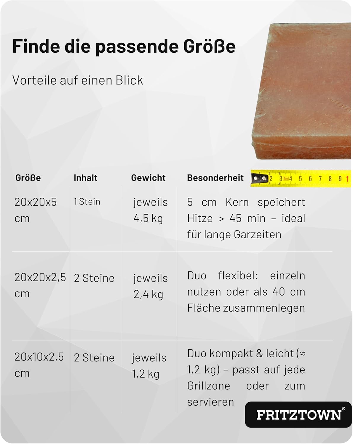 - Die zusätzliche Stärke des Grill-Salzsteins sorgt für eine verbesserte Wärmespeicherung. Dies bedeutet, dass das Grillgut gleichmässig gegart wird und die Wärme länger gehalten wird, um ein optimales Grillergebnis zu gewährleisten