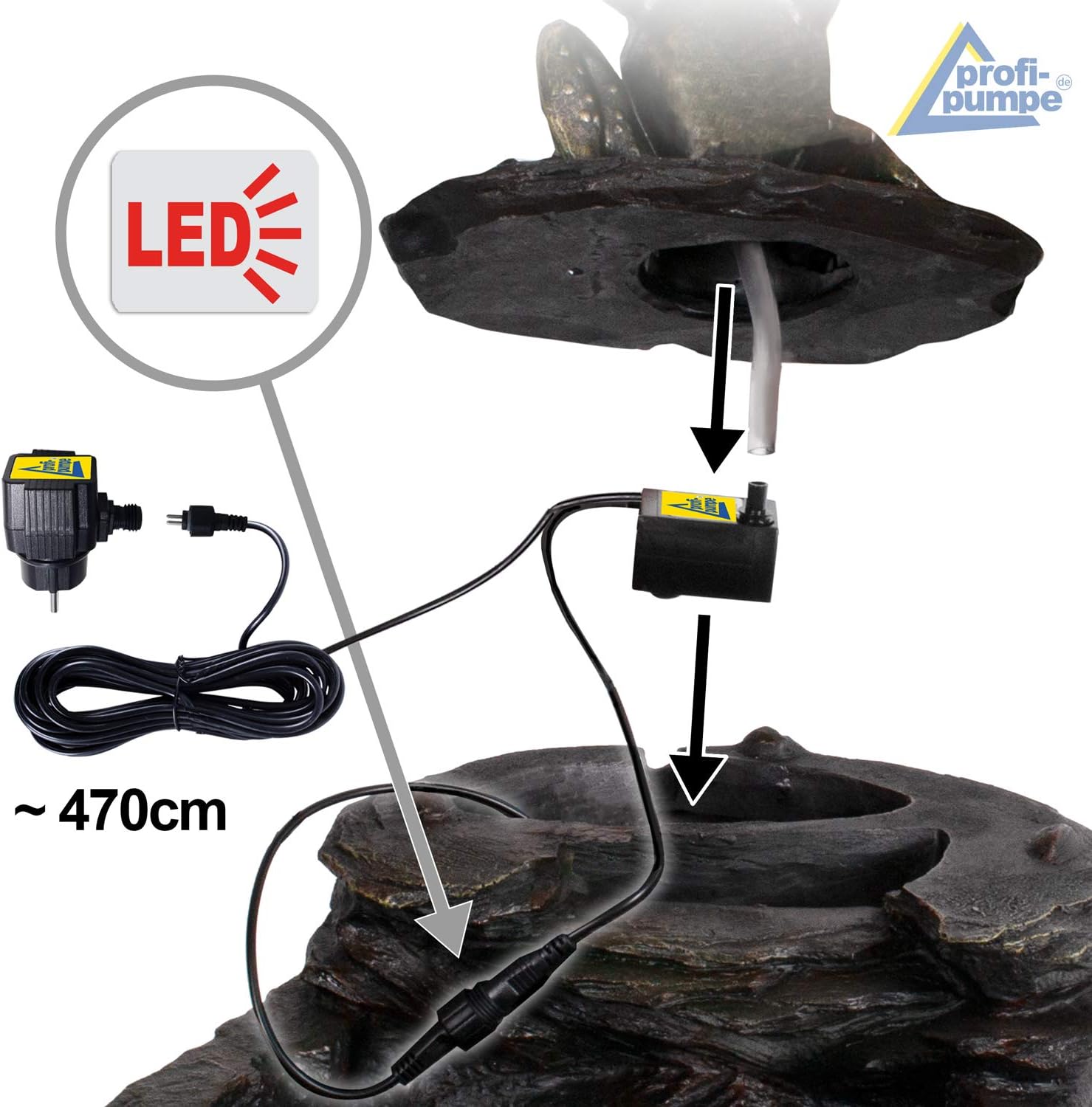 - Steckfertiger, einfach zu montierender, sofort einsatzbereiter Indoor- und Outdoor-Brunnen in phantasievollem Design in schöner Stein- und Bronze-Nachbildung mit LED-Beleuchtung