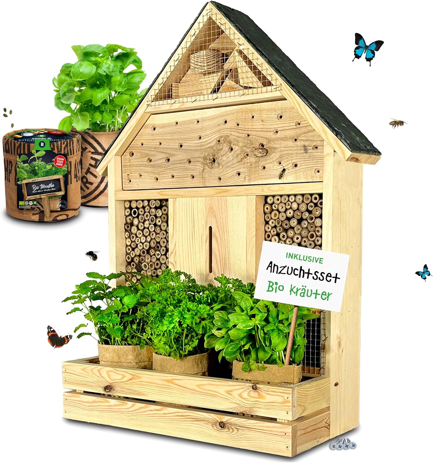 - QUALITÄT – Das robuste Insektenhotel mit Pflanzenbalkon, handgefertigt in der EU, kann mit dem zugehörigen stabilen Befestigungshaken an Baum oder Wand individuell montiert werden. Ein Gitter am Insektenhaus bietet Schutz vor Fressfeinden.