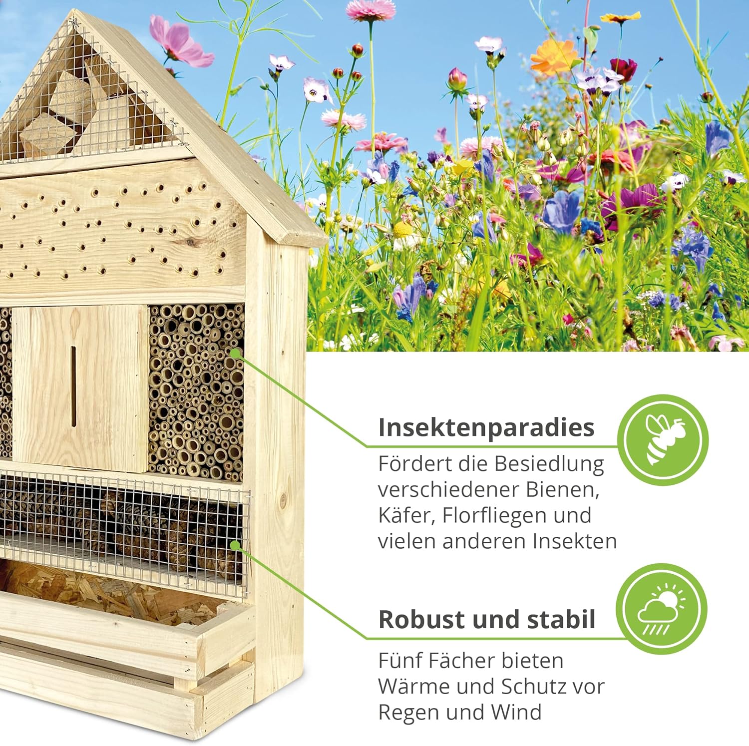 - QUALITÄT – Das robuste und grosse Insektenhotel mit Pflanzenbalkon, handgefertigt in der EU, kann mit den zugehörigen stabilen Pfählen sicher im Boden verankert werden. Ein angebrachtes Gitter am Insektenhaus bietet Schutz vor Fressfeinden.