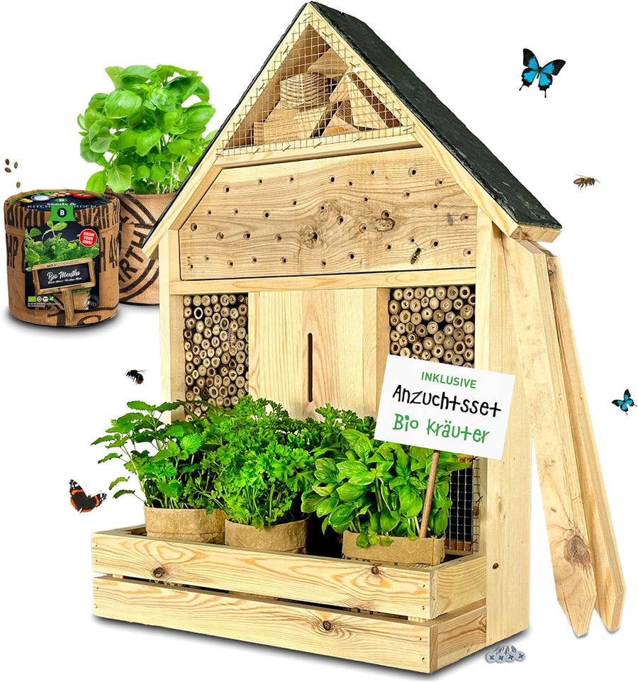 - QUALITÄT – Das robuste Insektenhotel mit Pflanzenbalkon, handgefertigt in der EU, kann mit den zugehörigen stabilen Pfählen sicher im Boden verankert werden. Durch das Schieferdach ist es wetterbeständig, das Gitter am Insektenhaus bietet Schutz