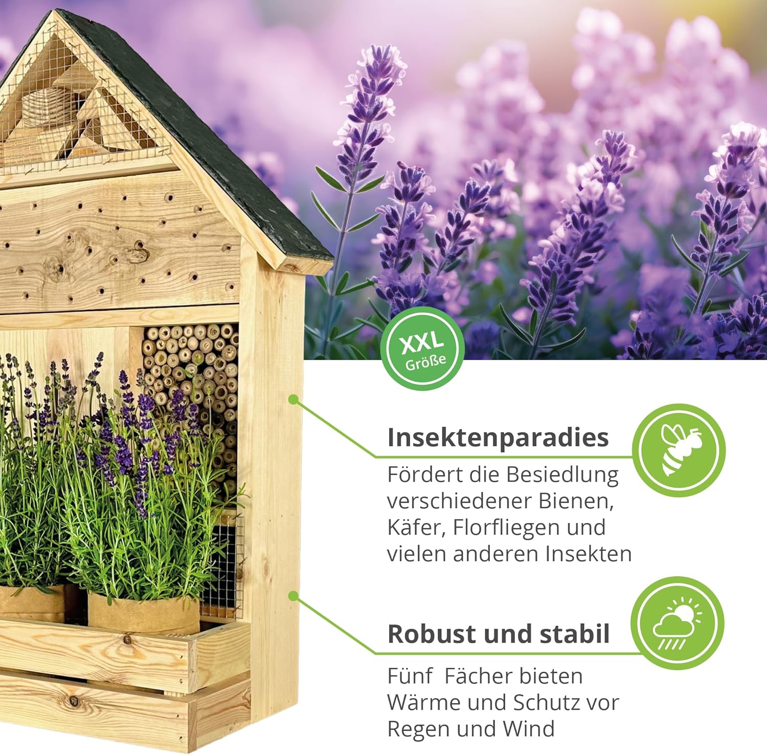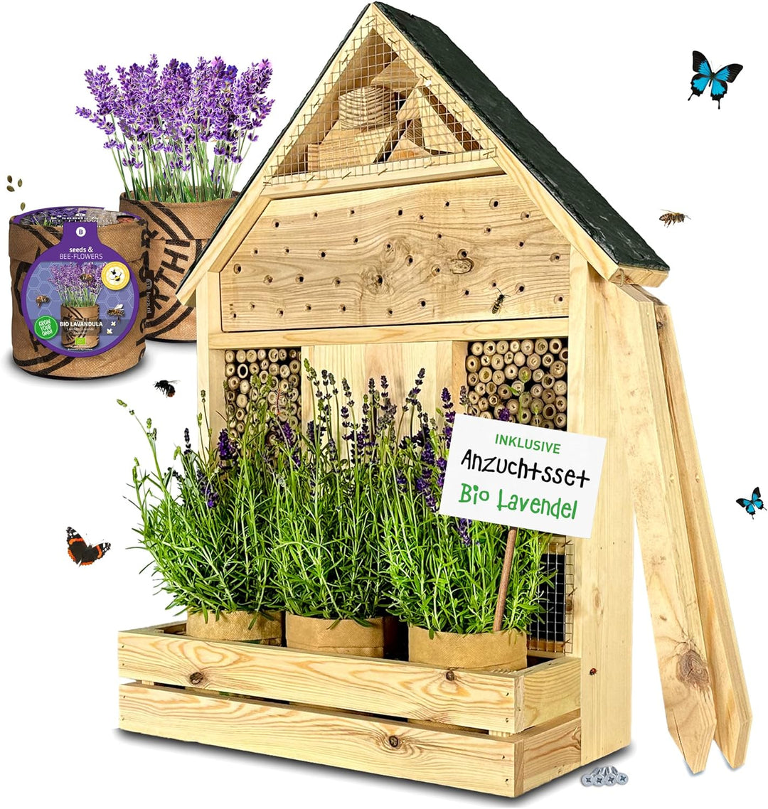 - QUALITÄT – Das robuste Insektenhotel mit Pflanzenbalkon, handgefertigt in der EU, kann mit den zugehörigen stabilen Pfählen sicher im Boden verankert werden. Durch das Schieferdach ist es wetterbeständig, das Gitter am Insektenhaus bietet Schutz