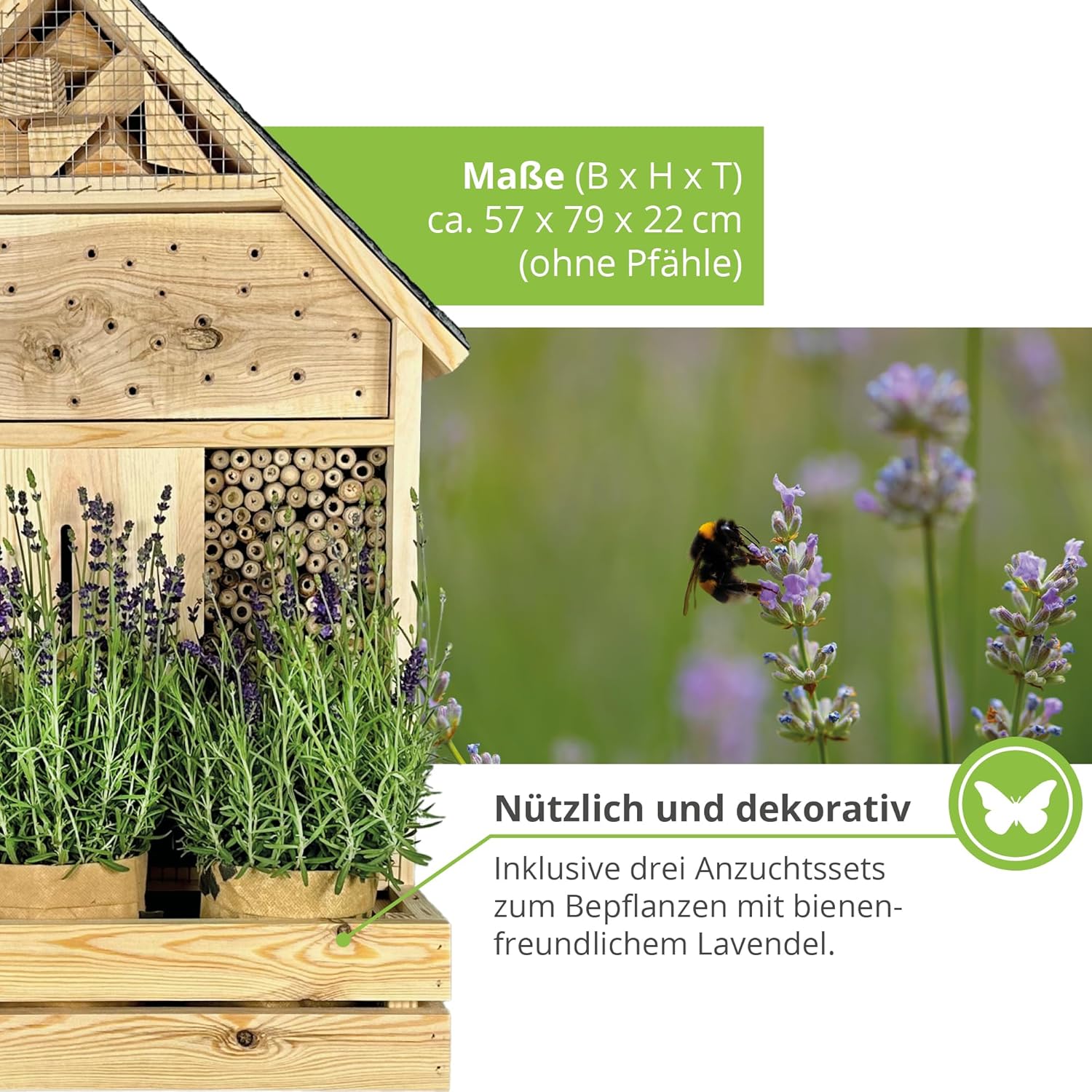 - NATURBELASSEN – Das massive Insektenhotel ist aus stabilem, naturbelassenem Holz gefertigt (Gewicht ca. 16kg). Mit einer Breite von 57cm, Höhe 79cm (ohne Pfähle) und einer Tiefe von 22cm passt das Bienenhaus perfekt an geschützte Orte im Garten.