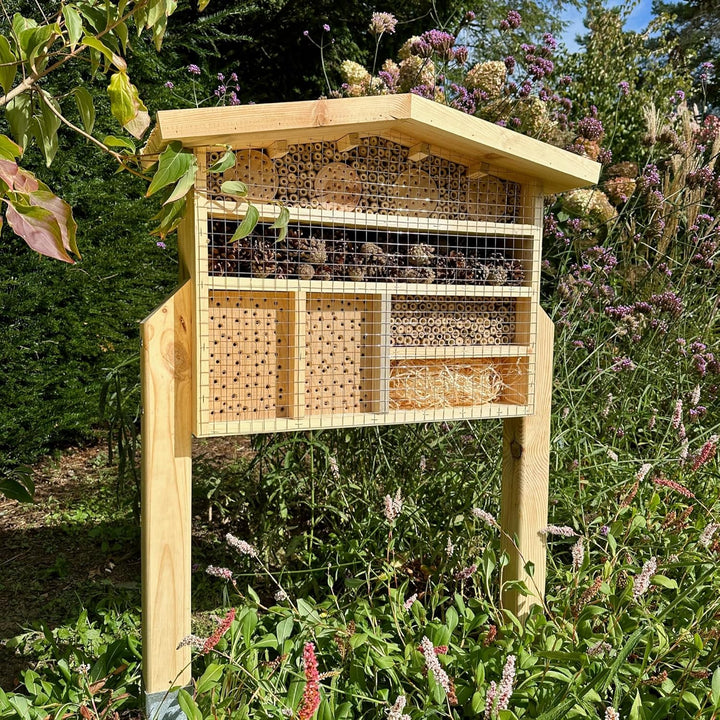 - QUALITÄT – Das robuste und grosse Insektenhaus, handgefertigt in der EU, kann mit den zugehörigen stabilen Pfählen und Bodenhülsen sicher im Boden verankert werden. Ein angebrachtes Gitter am Insektenhaus bietet Schutz vor Fressfeinden.