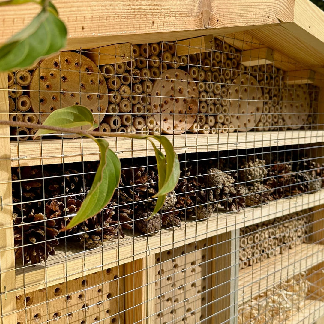 - ARTGERECHT – Die verschiedenen natürlichen Füllmaterialien und Niströhren in dem Insektenhotels schaffen Bruthilfe für Insekten aller Art und Lebensraum im Garten oder auf dem Balkon.