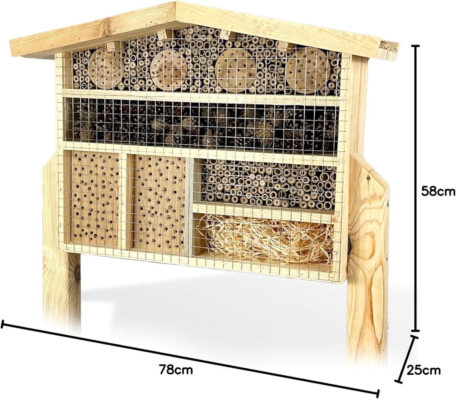 - NATURBELASSEN – Das massive Insektenhotel ist aus stabilem, naturbelassenem Holz gefertigt (Gewicht 26kg). Mit einer Breite von 78cm, Höhe 58cm (ohne Pfähle) und einer Tiefe von 25cm passt das Bienenhaus perfekt an geschützte Orte im Garten.