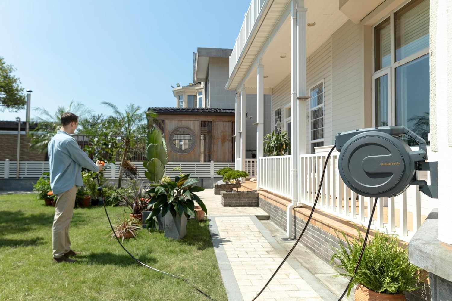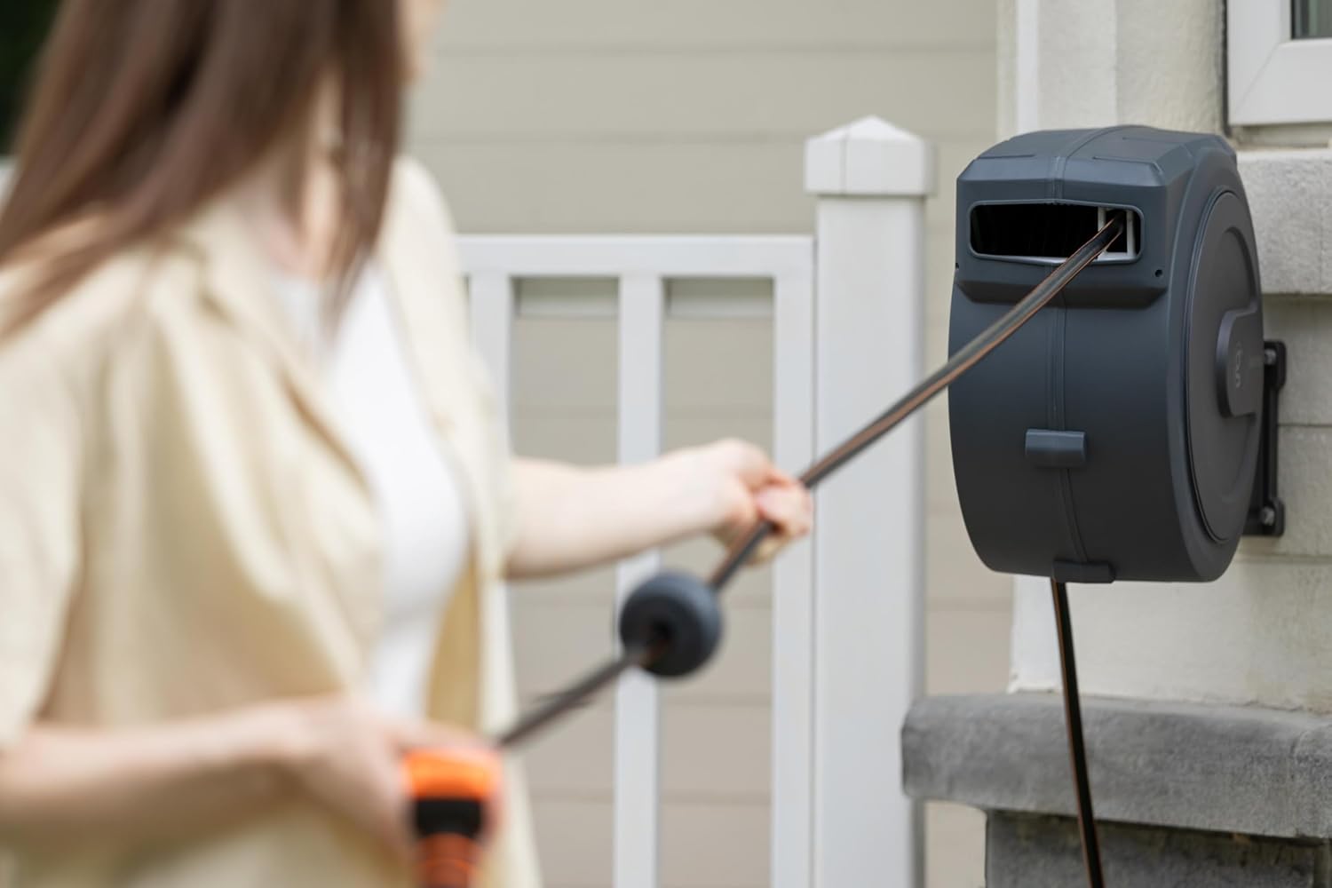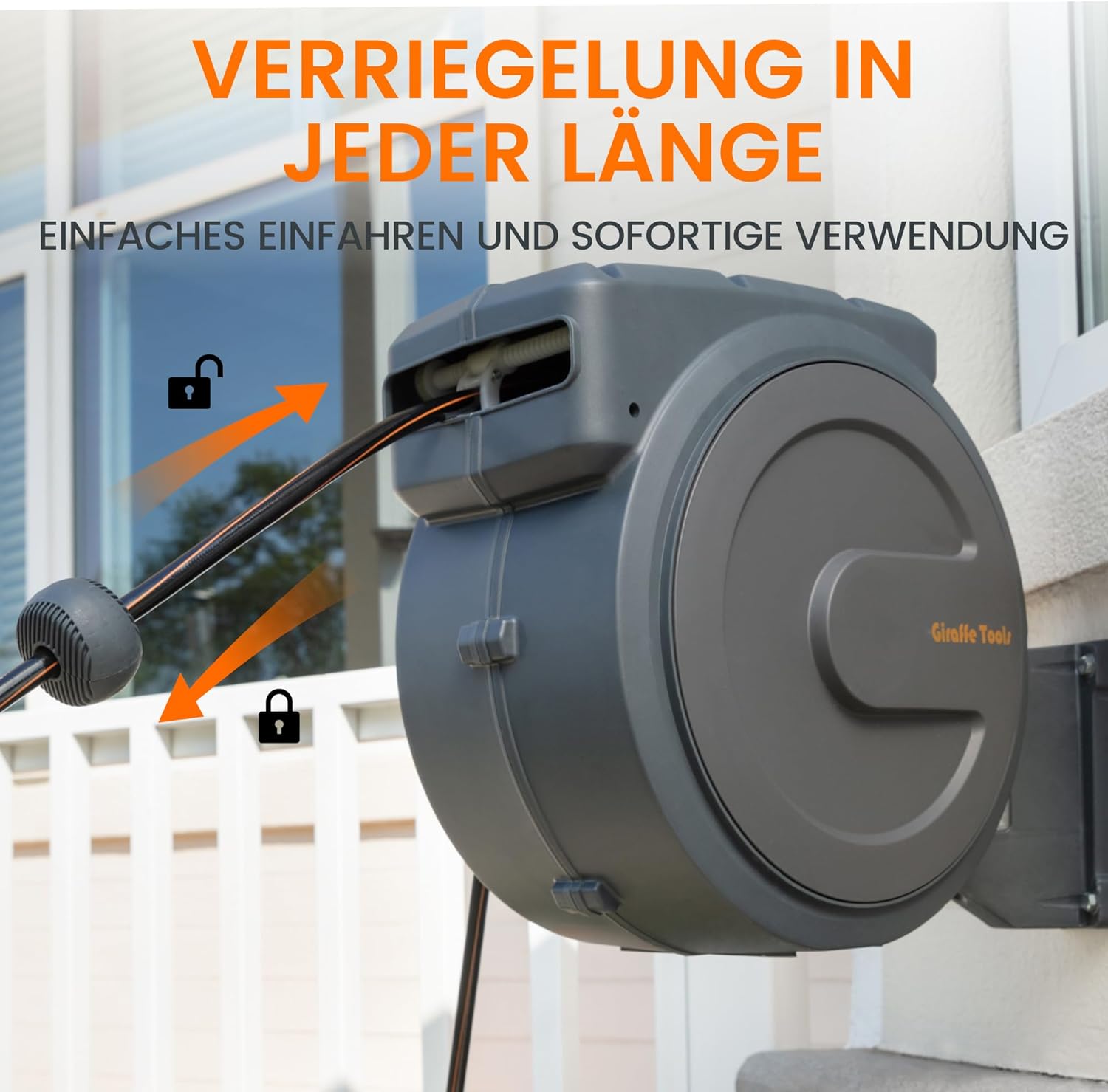 - AUTOMATISCHES RÜCKZUGS & UND VERRIEGELUNGSSYSTEM - Der Schlauchaufroller verfügt über eine automatische Rückzugsfunktion, die ein müheloses und platzsparendes Wiederauffinden des Schlauches ermöglicht. Dank des Verriegelungssystems kann der
