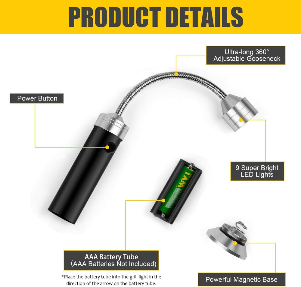 - 【Super Hell】Mit 9 Hochhelligkeit-LEDs bietet das Grill Licht einen superhellen,blendfreien und breiten Lichtstrahl,um Ihren gesamten Kochbereich sofort zu beleuchten und perfekt gekochtes Essen zu jeder Zeit zu gewährleisten.Grillleuchten mit 3,AAA