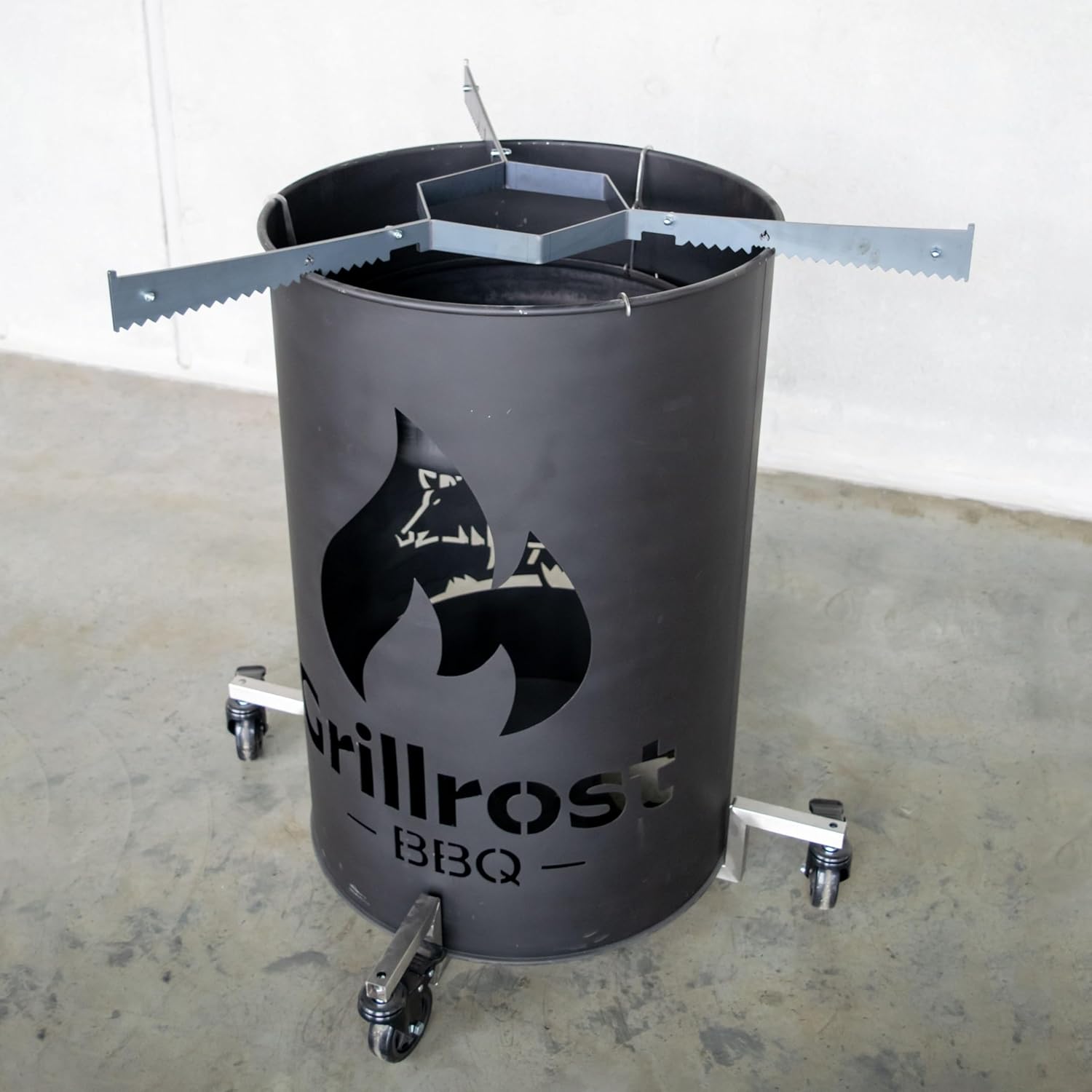 - Einfach die Auflageleisten auf das Fass, die Tonne oder den Kugelgrill auflegen und die Feuerplatte auf die Auflageleisten auflegen.