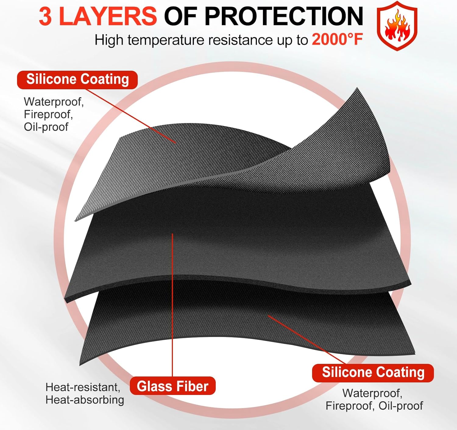 - 【Doppelseitiger Hitzeschutz】Gefertigt aus hochwertiger Glasfaser mit Silikonbeschichtung, beidseitig nutzbar und hitzebeständig bis 2000°F. Bietet zuverlässigen Schutz vor Funkenflug, Glut und Hitze – auch bei längerer Nutzung
